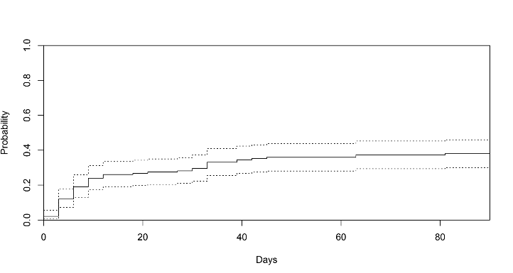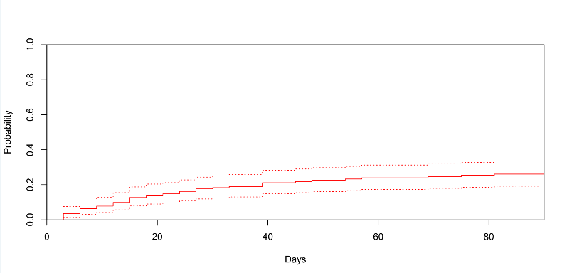 Results: Between 2008 and 2023, 139 patients received 145 transplants; 48% females, mean age 44 years and 70% with a prior history of thrombosis. Of the 145 transplants, 6/145 (4.1%) had a thrombotic event either in surgery or in the 24 hours after surgery. The cumulative incidence of thrombosis was 26.1% (95% CI 19.1 – 33.5%) from day 2-92 (Figure 1). Median transfusion requirements (units) for day of surgery and 24 hours after were 10 (red cells), 4 (plasma), 1 (platelets) and 2 (cryoprecipitate). The cumulative incidence of major bleeding was 38.0% (95% CI 30.0 – 36.0%) from day 2-92 (Figure 2). Thrombotic events occurred in 22 (15%), bleeding events in 38 (27%), and both bleeding and thrombotic events in 15 (11%). There were no bleeding or thrombotic events in 67 (47%) transplants. 8 patients were transplanted for abdominal vascular catastrophe, where long-term survival would not be possible without transplantation (further details will be presented). 6 patients received direct oral anticoagulants post-transplant; drug levels were in the expected range.