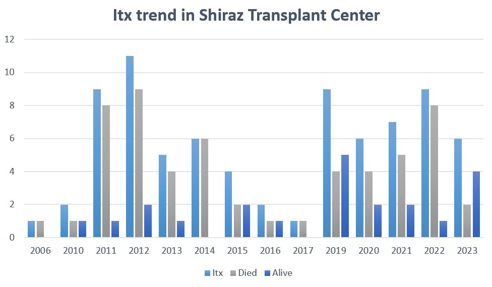 Results: From the first Itx performed in 2006 to 2023, 78 Itx were performed at Shiraz Transplant Center. 56 cases died and 22 are alive. 39 (50%) were male and the mean age was 35.2 years. 38 cases underwent isolated Itx and the others were multi-visceral transplants.