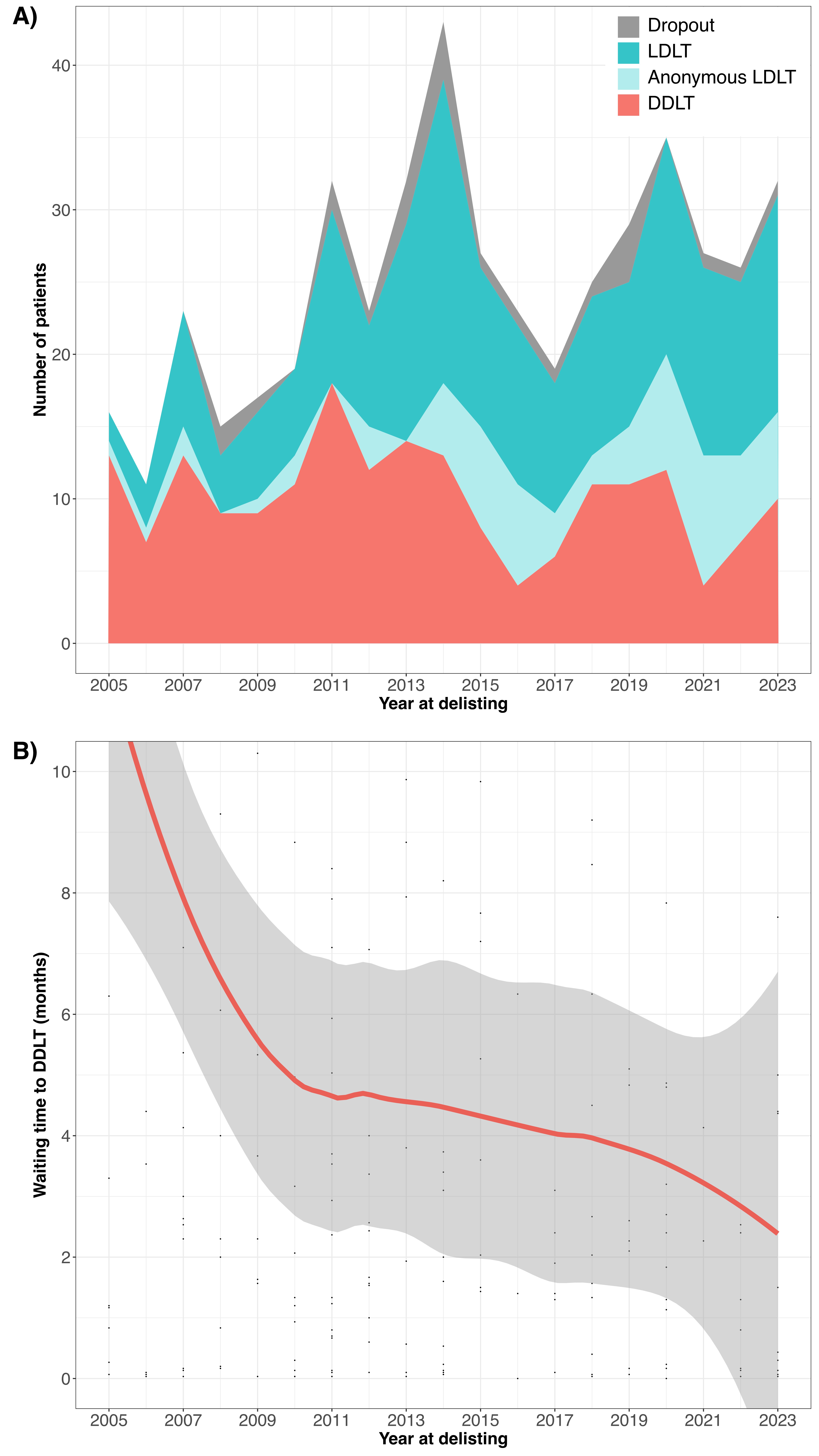 Results: Among 474 candidates, 219 (46%) had potential live donors. The pLDLT group was younger than the pDDLT group (median: 9 (IQR:5-41) vs. 28 (IQR:6-108) months, p<0.001). The most common etiology was biliary atresia (pLDLT:53%, pDDLT:28%), while acute liver failure was more prevalent in the pDDLT group (20% vs. 6%, p<0.001). In the pLDLT group, the waitlist dropout rate was 0.5% (n=1), compared to the pDDLT group with a significantly higher dropout rate of 9% (n=23). The median wait time was shorter for pLDLT than pDDLT (1.9 (IQR:1.2-3.9) vs. 2.6 (IQR:1.0-5.2) months, p=0.04). Superior survival rates in the pLDLT group were observed at 1-, 5-, and 10-years post-listing (98.6%, 96.6%, 96.6% vs. 87.6%, 84.4%, 83.1%, log-rank p<0.001) (Figure1A) with an 72% reduced mortality risk (aHR 0.28, 95% CI 0.12-0.64, p=0.003). The survival benefit persisted in the subgroup analysis for biliary atresia and acute liver failure (Figure1B&C). In the as-treated analysis, 67 pDDLT candidates benefited from anonymous living donation, resulting in 258 (57%) receiving LDLT and 192 (43%) DDLT. LDLT recipients demonstrated superior survival (log-rank p=0.003) (Figure1D) with a 65% mortality risk reduction (aHR 0.35, 95% CI 0.13-0.93, p=0.036). Although the number of patients listed annually increased over the study period, the waiting time for DDLT has shortened, potentially connected to an increase in live donors (Figure2A&B).