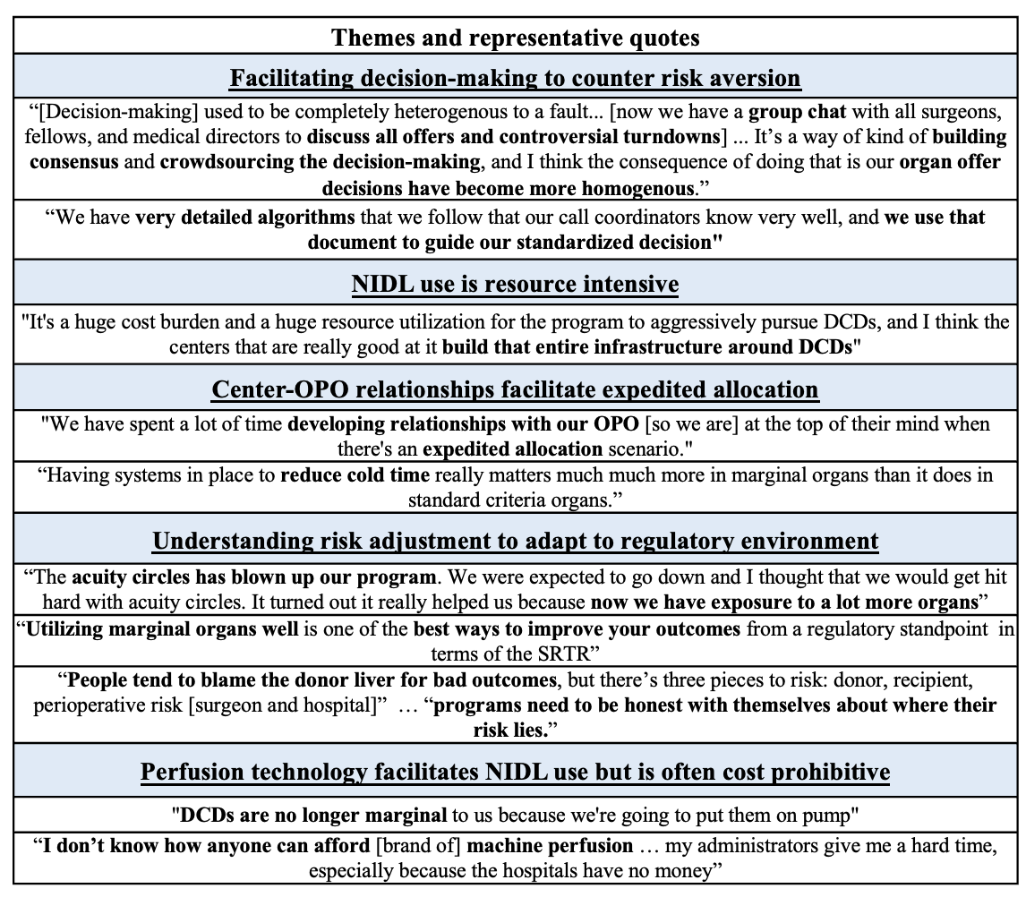 Conclusion: The determinants of NIDL use are multifactorial and span all levels of the transplant ecosystem. These findings may elucidate areas of intervention or process improvement for transplant centers seeking to increase their NIDL utilization. Policies around reimbursement, organ allocation, and performance metrics should consider their effect on NIDL utilization.