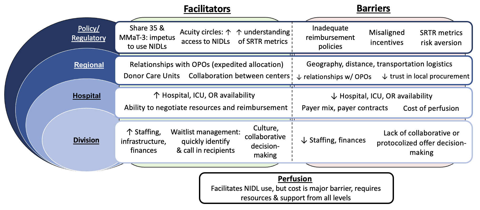 Results: Five themes emerged related to how centers approach NIDLs (Figure 1). 1) Facilitating decision-making to counter risk aversion. 2) NIDL use is resource intensive. 3) Center-OPO relationships facilitate expedited allocation. 4) Understanding risk adjustment to adapt to regulatory environment. 5) Perfusion technology facilitates NIDL use but is often cost prohibitive. Figure 2 shows barriers and facilitators to NIDL use across levels of the transplant ecosystem. Interviewees proposed potential strategies to improve NIDL use nationally: enhanced collaboration and best practice sharing, greater understanding of viability assessment with perfusion, increased reimbursement for perfusion and NIDLs, and refined policies to facilitate expedited allocation of NIDLs.