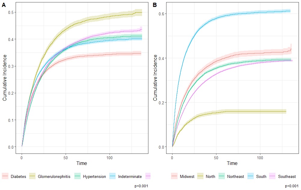 Conclusion: We found that women and racial minorities faced disadvantages in kidney transplantation. Additionally, we observed regional disparities, with the North region having the lowest probability of receiving a transplant and longer times on dialysis before being waitlisted. In contrast, patients in the South regions had a higher likelihood of receiving a transplant and shorter times on dialysis before being waitlisted. It is urgent to implement approaches to enhance transplant capacity in the North region and address race and gender disparities in transplantation.