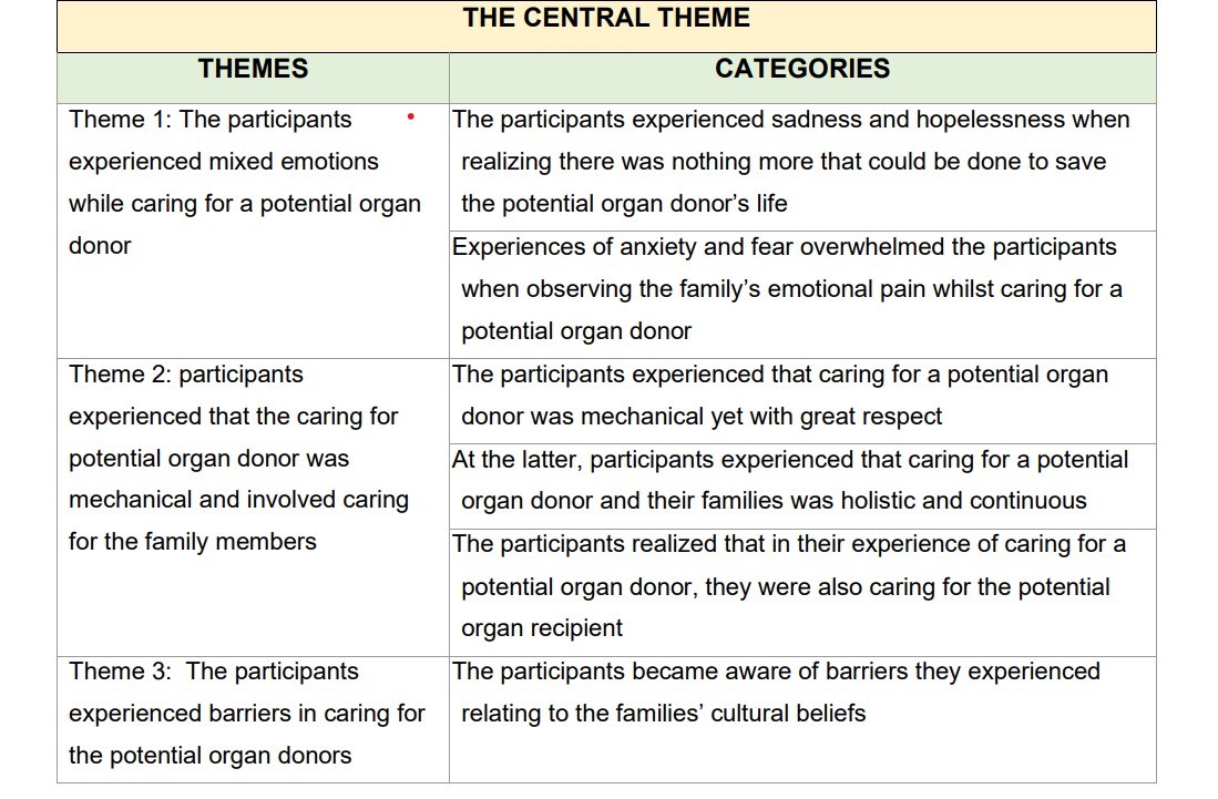 Three (3) themes emerged: The participants experienced mixed emotions ranging from sadness and hopelessness to anxiety and fear while caring for a potential organ donor. They also experienced that caring for a potential organ donor was mechanical and involved caring for the family members as well as experiencing barriers in caring for the potential organ donors. These barriers to organ donation stemmed from diverse religious and cultural beliefs in the South African population.