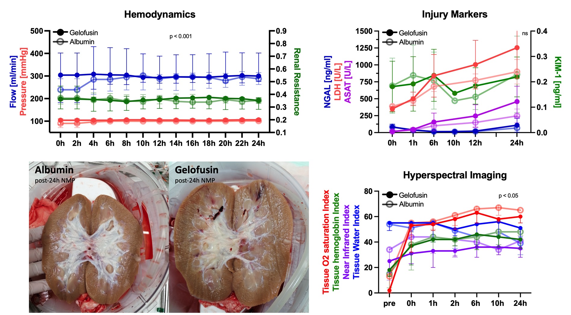 Methods: Five porcine kidney pairs were normothermically perfused for 24 hours with autologous, leukocyte filtered, whole blood diluted with either gelofusin or human albumin. A novel prototype kidney NMP device was used for continuous flow perfusion at 90 mmHg. Automated oxygenation and nutrient supply were managed by on-board sensors. Perfusion dynamics were recorded, perfusate and urine samples were obtained and analyzed for composition and injury markers throughout the perfusion duration. Hyperspectral imaging (HSI) was carried out and mitochondrial function was assessed via high-resolution respirometry.