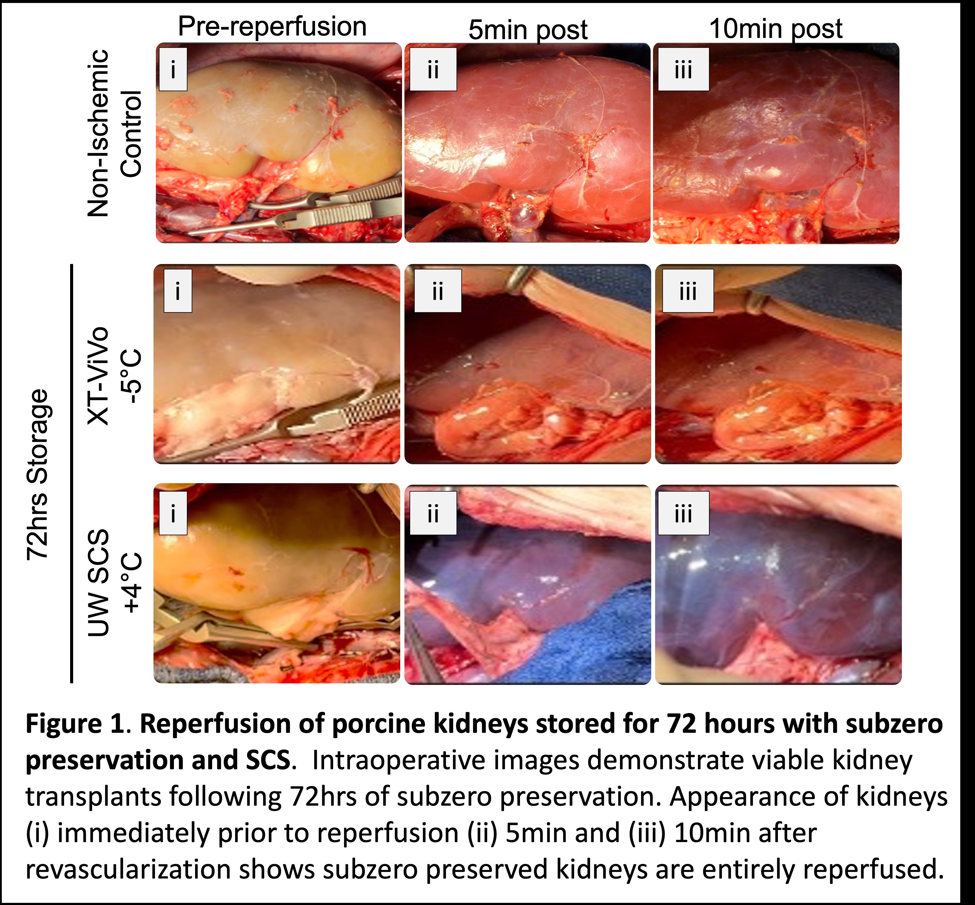 Method: We assessed subzero preservation of kidneys with XT-ViVo and TimeSeal in a pig renal autotransplantation model. Kidneys were preserved with XT-ViVo at -5°C or static cold storage (SCS) for 0, 24, 48, and 72 hours and transplanted. The native kidney was resected at the time of transplantation and renal function of the preserved kidney was assessed until endpoint (30 to greater than 100 days post-transplant).