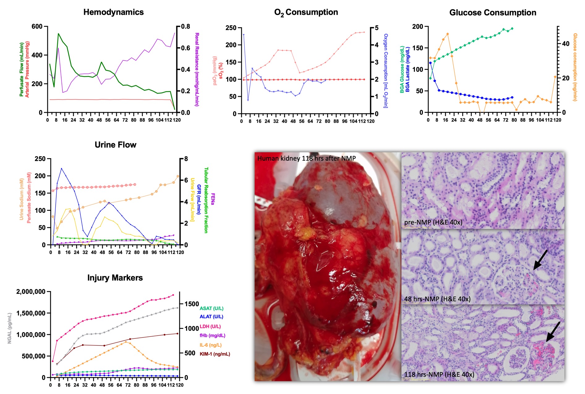 Results: 162 porcine and 69 discarded human kidney grafts were perfused resulting in over 8,100 hours of kidney perfusion. Preservation times for human kidney grafts were extended to 48 hours in 11 kidneys and further to a maximum of 118 hours in one human kidney. In this kidney, perfusion flow was stable (median 230 ml/min) at 90 mmHg, but eventually declining after day 4 to 150 ml/min. Stable oxygen and glucose consumption (median 1.62 mL/min, 5.99 mg/min), lactate clearance, pH regulation and uninterrupted urine flow (0.82 mL/min, GFR 1.78 mL/min) were found. Over the course of perfusion, a moderate rise in injury markers was noted. Macroscopic assessment as well as histology show preserved tissue architecture (Banff score after 118 hours of NMP: i0, t0, g0, ptc0, v0, ti0, i-IFTA0, t-IFTA0, ci0, ct0, cg0, mm1, cv0, ah2) with few glomerular microthrombi after multi-day perfusion.