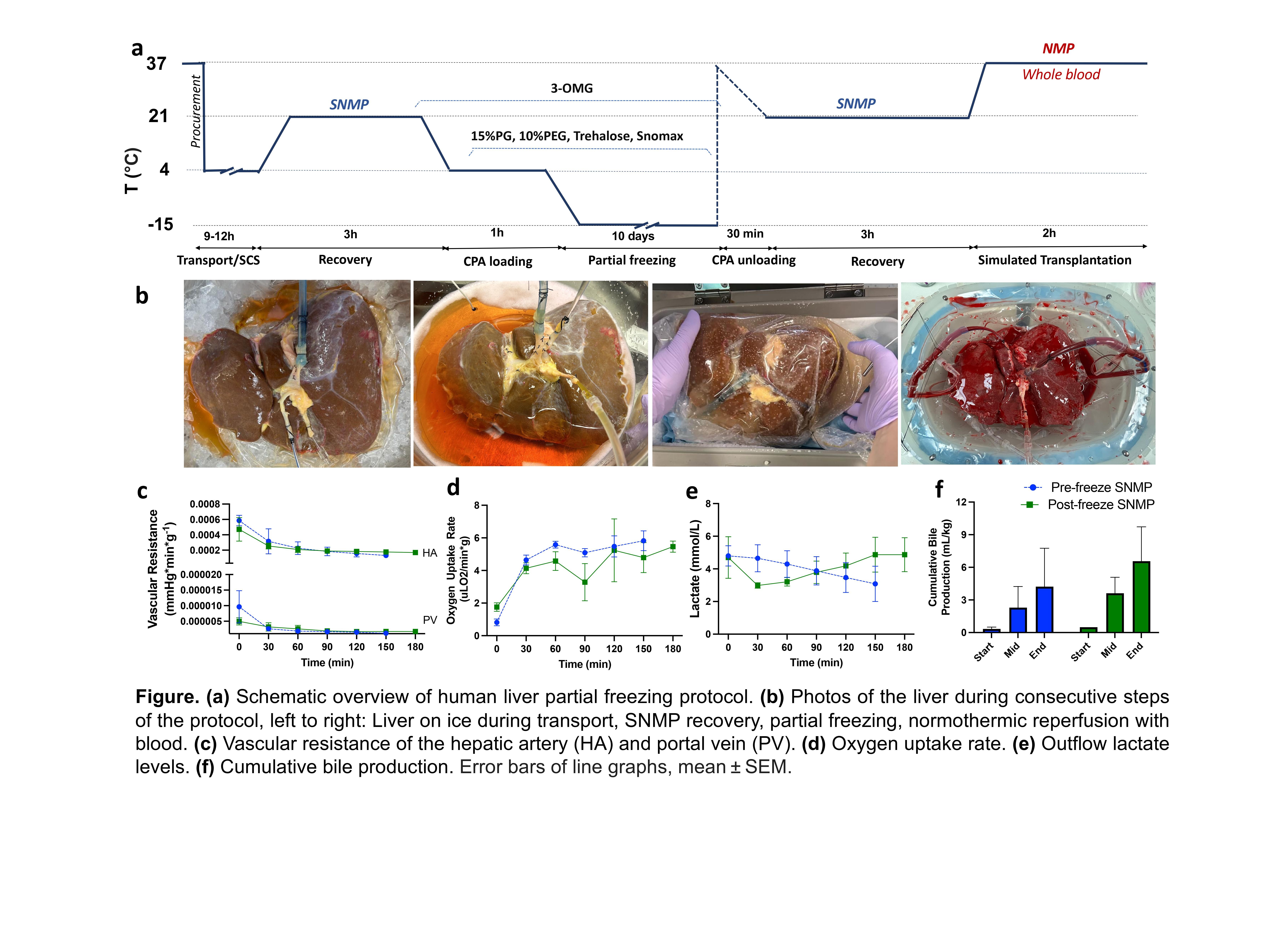 Results: Human livers demonstrated comparable portal vein (p=0.464) and hepatic artery resistance (p=0.66) during pre- and post-freeze, indicating no additional resistance in partially frozen livers. Oxygen uptake rate rose and stabilized similarly (p=0.169). Lactate levels were comparable before and after freeze, indicating no major cellular injury (p=0.891) Cumulative bile production was higher after freeze, but not significant (p=0.179), highlighting the reserved functional capacity.