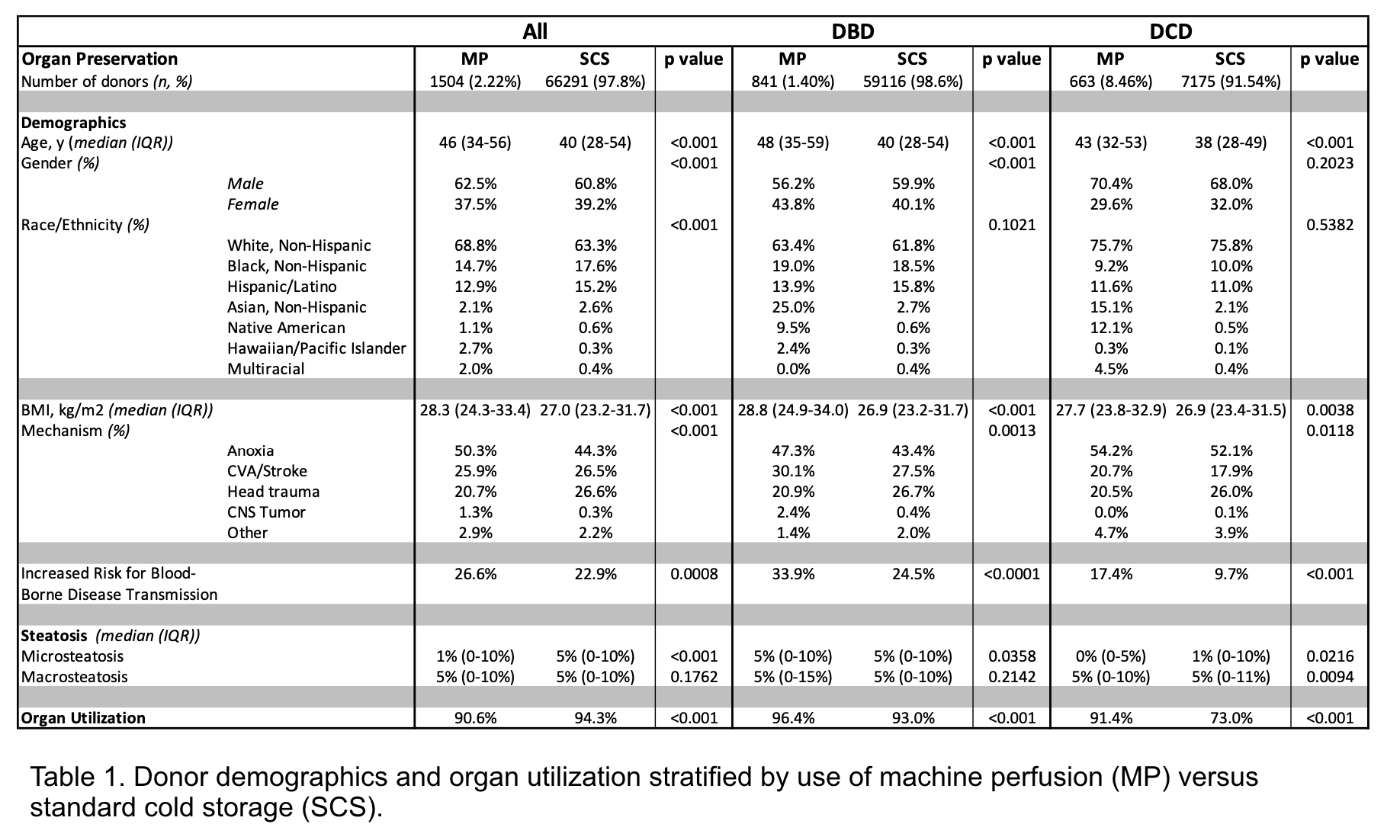 Methods: The OPTN Standard Transplant Analysis and Research database was used to identify all donor livers procured with the intent for transplant between 10/27/2015 (date of first recorded machine perfusion) and 6/30/2023 (n=67,795). Liver allografts were divided into donation after brain death (DBD, n=59,957) and donation after circulatory death (DCD, n=7,873) cohorts and evaluated by standard cold storage (SCS) or MP preservation method. Donor demographics, organ utilization, and graft survival were evaluated. Results were analyzed using Kruskal-Wallis and chi square testing, with graft and patient survival analyzed using Kaplan-Meier methods.