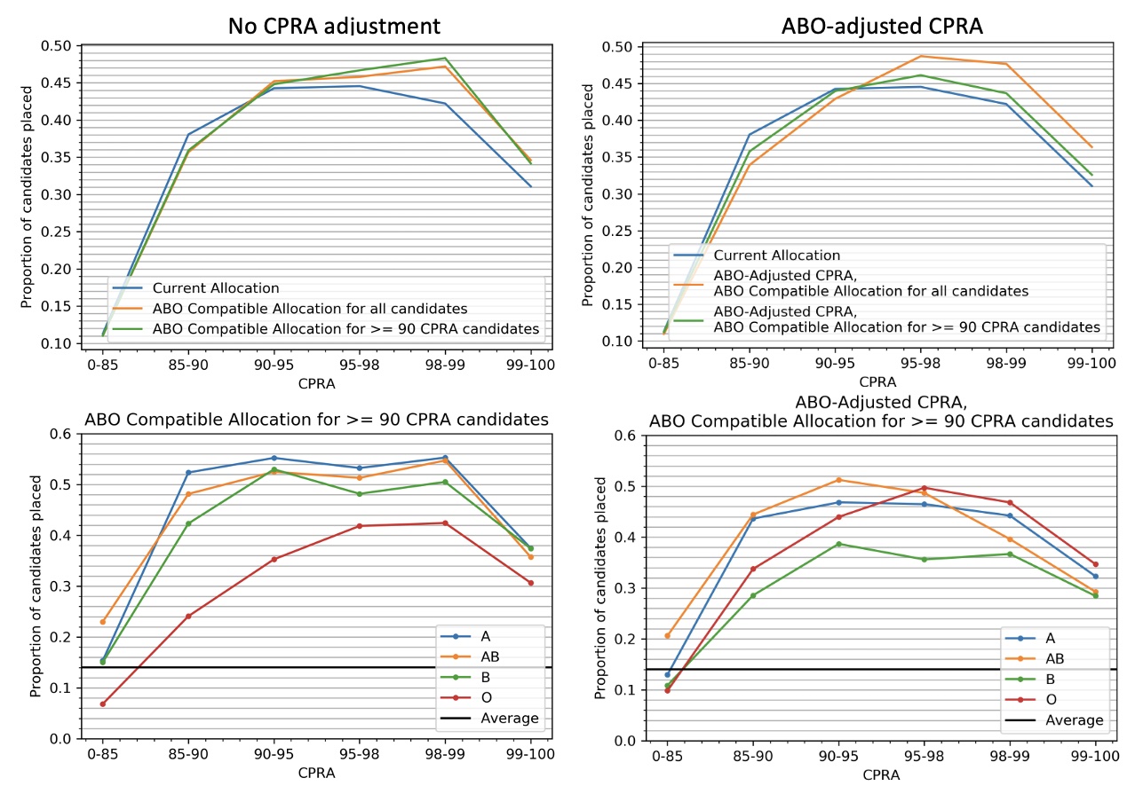 Results: For O blood type candidates, the ABO-Adjusted CPRA policy for >= 90 CPRA candidates yields a transplant rate of 0.35 in the 99-100 CPRA category. This is higher than the 0.31 rate under the ABO Compatible Allocation for >= 90 CPRA candidates policy, and higher than the 0.32 rate under the Current Allocation policy. For B blood type candidates, the transplant rate under the ABO-Adjusted CPRA policy is 0.28 in the 99-100 CPRA category. This is higher than the 0.27 rate under the Current Allocation policy, but lower than for the ABO Compatible Allocation for >= 90 CPRA candidates policy without ABO adjustment (Fig 2).