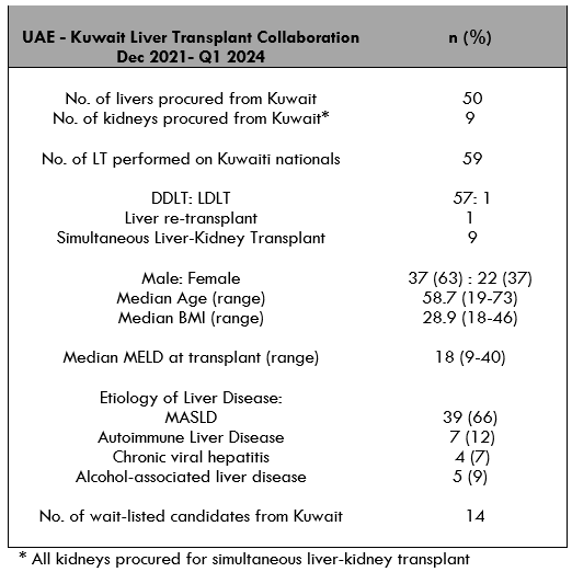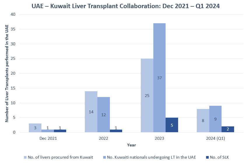 Methods: In the Middle East Gulf region, there is a scarcity of established programs in deceased organ donation. Apart from the UAE and the Kingdom of Saudi Arabia, few other countries in the region have established programs in deceased organ donation. This presented a unique opportunity to establish a collaborative organ sharing agreement that would optimize utilization of deceased donor organs in the region and provide improved access to liver transplant (LT). A successful organ sharing agreement was initiated with Kuwait in December 2021, that has since grown significantly and provided timely access to Kuwaiti nationals in need of LT, while promoting awareness of deceased organ donation.