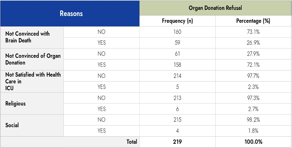 Methodology: This study involves a retrospective analysis of medical records provided by transplant coordinators in the donor medical records of 2022. A random sampling technique was utilized to select participants. The analysis aims to identify key determinants for family refusal of deceased organ donation. Additionally, a literature review on family consent for deceased organ donation in Muslim countries was conducted for data comparison. IBM SPSS 29 was employed for data analysis.