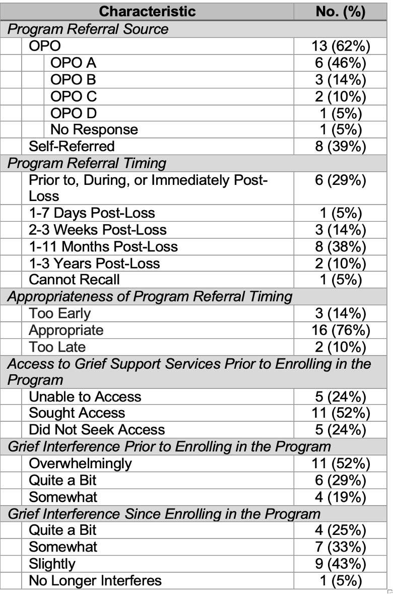 Methods: Investigators conducted semi-structured interviews with 21 program participants and 6 OPO staff members. Questions assessed referral process, source, timing, and appropriateness of the referral, access to grief support and/or mental health services prior to enrollment in the program, program resource(s) utilized, change in grief symptoms, and suggestions for improvement. Results were analyzed using both rapid qualitative analysis and descriptive statistics.