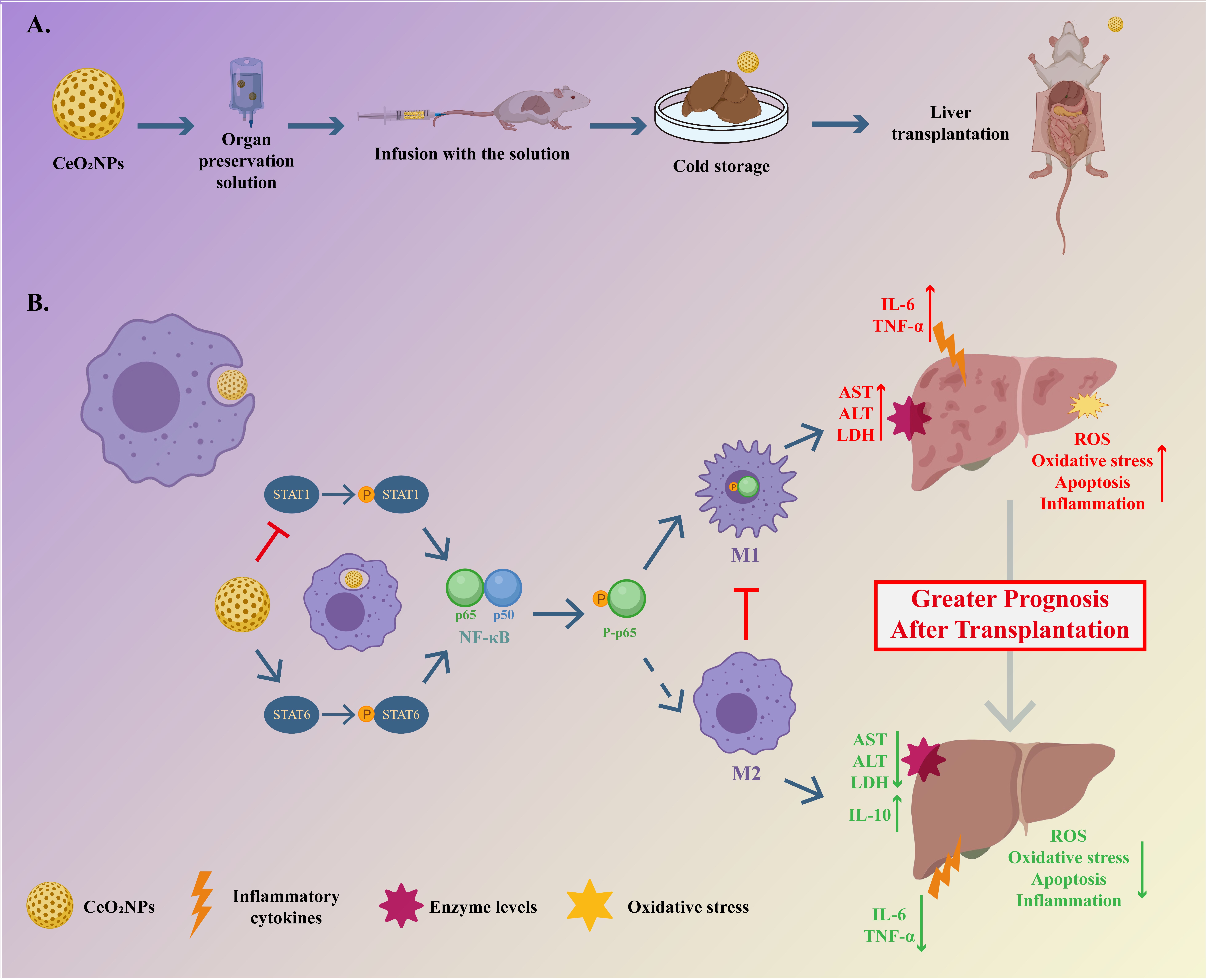 Results: The distribution of CeO2NPs in different organs indicates their specificity in murine liver and Kupffer cells. Additionally, CeO2NPs have been shown to improve liver injury, reduce ROS production and inflammation infiltration, and suppress hepatocyte apoptosis in mice that have undergone liver transplantation. Furthermore, the application of CeO2NPs aligns with M2 macrophage polarization, implying that they alleviate sterile inflammation following donor liver implantation through interaction with M2 polarization.