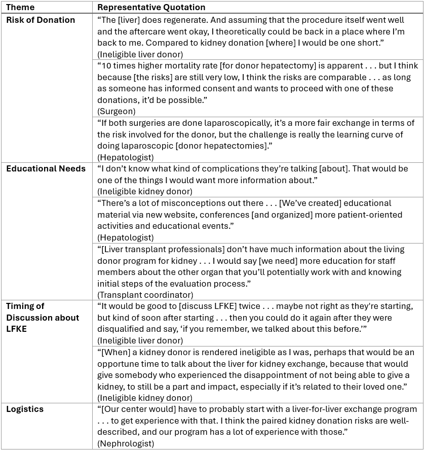 Methods: Ineligible living kidney and liver donors, and transplant professionals from high-volume US transplant centers completed 45-minute-long semi-structured interviews. Interviews included a deliberative briefing on LFKE. Interviews were audio-recorded, transcribed, de-identified, and analyzed using NVivo. We employed an inductive approach to identify themes.