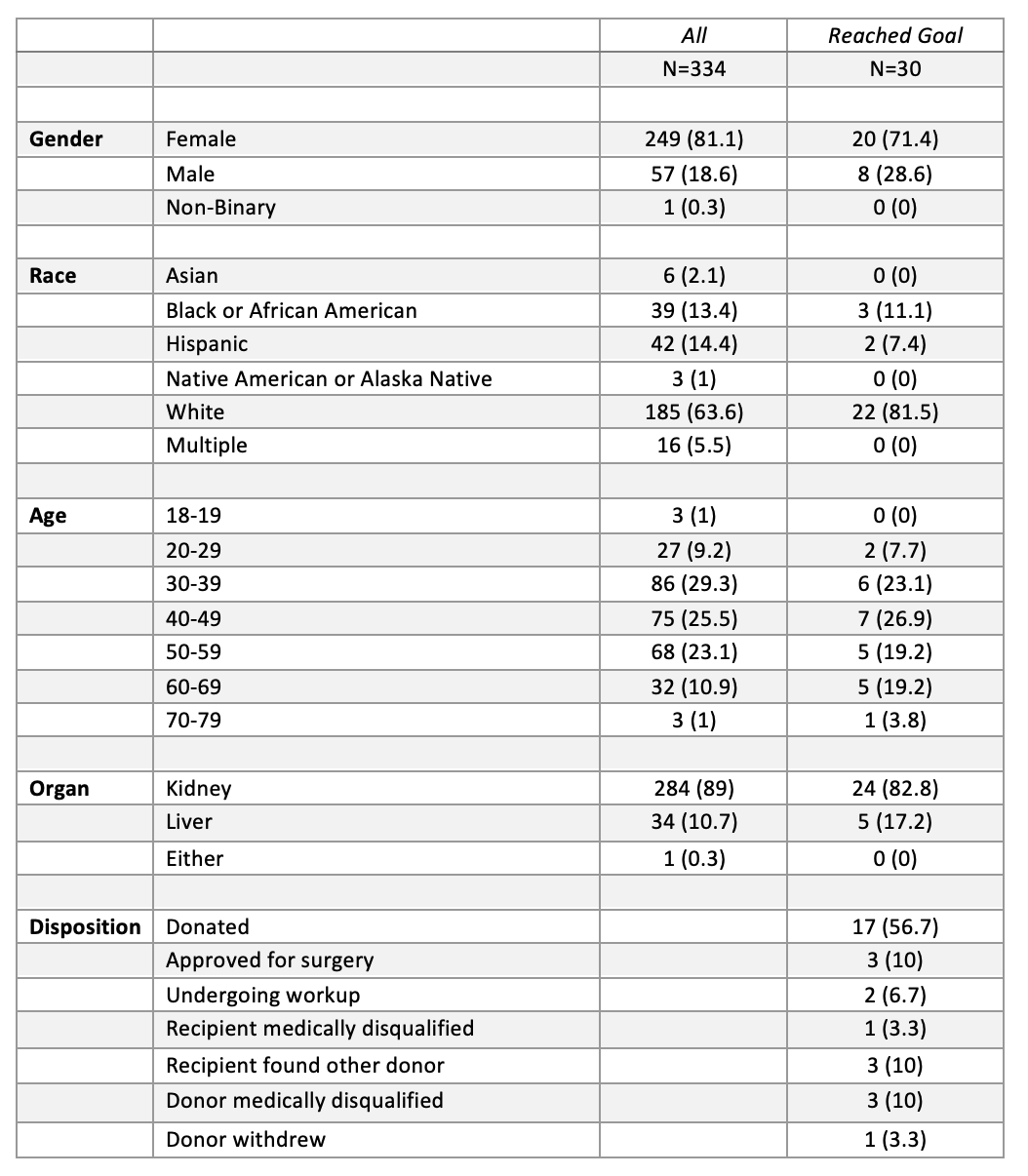 Results: Between 5/1/2022 and 2/20/2024, 334 participants from 38 US states and 65 transplant centers have been onboarded, including 34 liver donors (Table 1). The majority of participants are female (81%). To date, 30 (9%) participants have reached their goal (2 smoking, 28 weight loss). Weight loss was an average of 16lbs over 142 days. Donation was achieved by 17 (5.1%) participants (14 kidney, 3 liver). Goal weight was achieved by 15/128 (12%) participants utilizing OnPoint Nutrition, 15/141 (11%) using Noom, 0/52 (0%) using WeightWatchers. Amongst participants who reached their goal but have not donated, 3 are approved for surgery, 2 are undergoing workup, 4 have not donated for reasons related to the recipient, and 4 have not donated for reasons related to the donor.