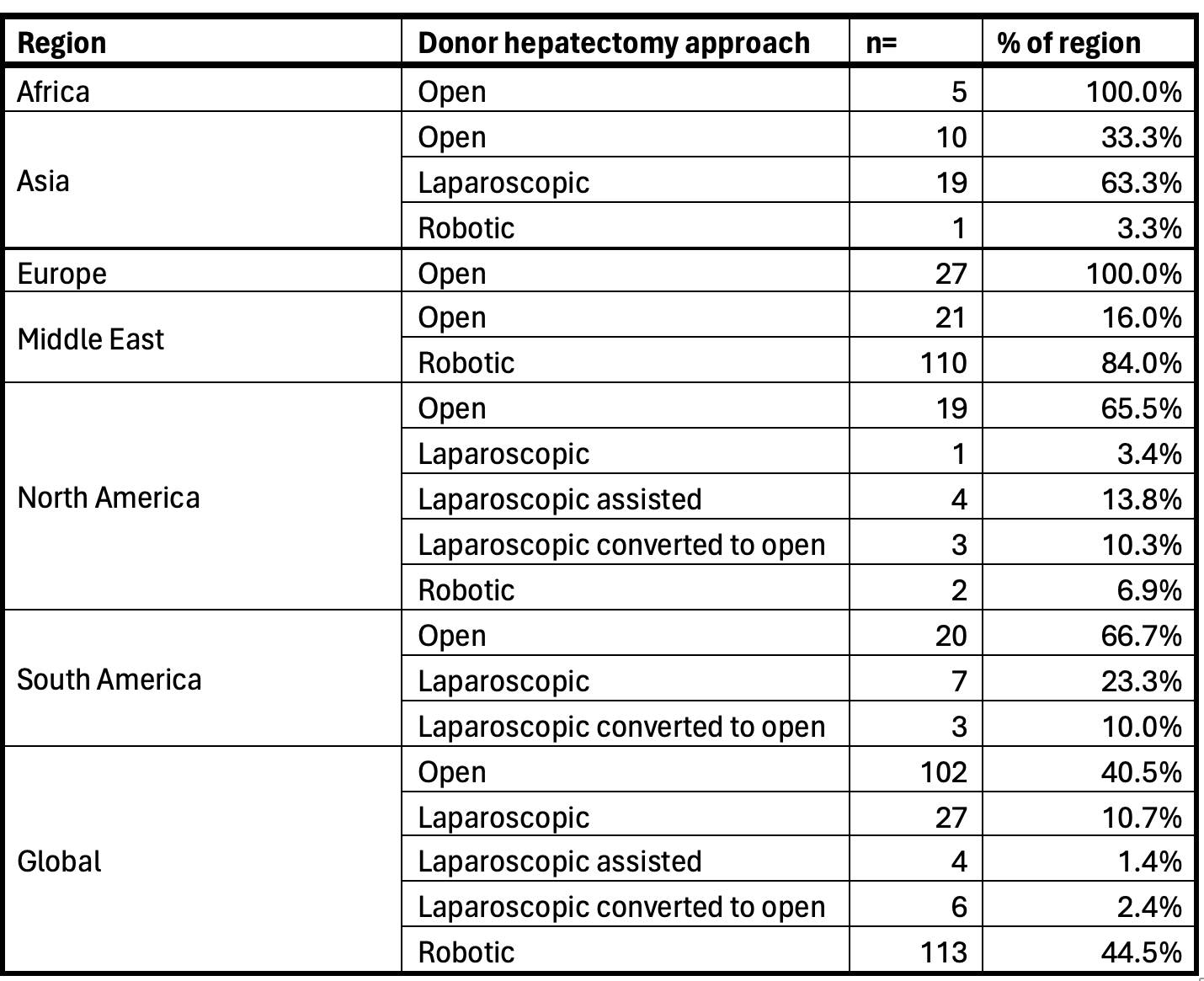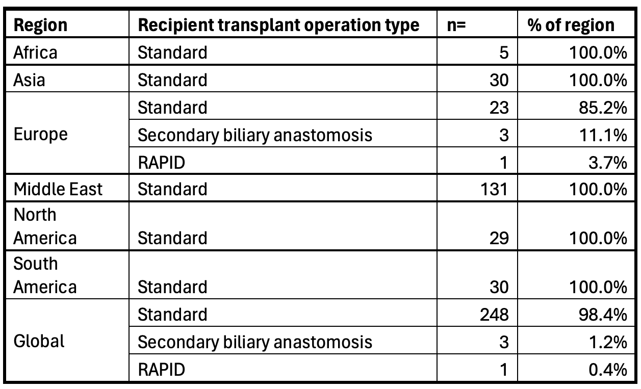 Results: A total of 504 cases (252 donor-recipient pairs) were examined. There was heterogeneity in donor hepatectomy technique (see table 1) with robotic approach most common among the cases reported to LDLTregistry.org, followed closely by open surgery. Majority of the robotic donor hepatectomies submitted to the Registry were performed in the Middle East, with a single centre accounting for 110 (43.6% of all submissions and 97.3% of robotic submissions). 98.4% (n= 248) of recipients had a standard transplant with a breakdown of the remainder shown in table 2.