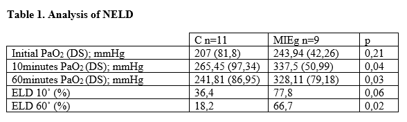 Results: Seventy-one eligible consenting donors were included of whom 20 were considered NELD (28.2%)-Table 1-. Those NELD in the MIEg showed a significant increase in PaO2/Fi02 at 10 and 60 min post-intervention. MIE implementation improved the PaO2 values at 10 and 60 min after intervention increasing the percentage of ELD donors when compared with the control group, No complications derived from the technique were observed.