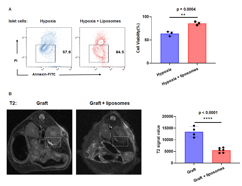 Results: In vitro, Fulips labeled cyanine 5.5 uniformly bound to islet cells membranes as observed by confocal microscopy. Under hypoxic conditions, the viability of islet cells was significant higher when co-cultured with Fulips than cultured alone (89.50±2.23% VS 67.60 ± 2.79%). Flow cytometry results showed a reduction in intracellular ROS levels of hypoxia islets cells after liposome treatment (79.20 ± 2.78% VS 55.70±2.47%). Hypoxia reduced insulin secretion by beta cells, while Fulips treatment reversed this trend. The islet cells co-cultured with Fulips were transplanted to the renal capsule of NCG mice, 3 days post-transplantation, magnetic resonance imaging indicated a reduction in T2 signal value (13419 ± 1120 VS 5499 ± 408) and shortened T2 relaxation time (119.0 ± 19.91 VS 43.80 ± 3.09) in the grafts which suggested reduced ROS levels and increased islet survival. TUNEL staining confirmed the results, that there was a reduction of apoptotic cells in liposomes co-cultured grafts compared to the control ones. DHE staining further demonstrated decreased ROS levels in liposome-treated grafts.