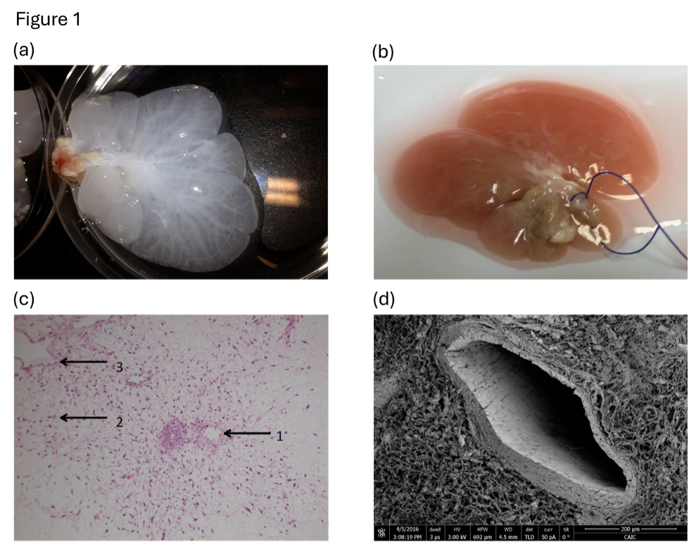 Results: Recellularised scaffolds changed in macroscopic appearance from a translucent (figure 1a) to an opaque (figure 1b) structure by day 30. Stem cells engrafted in portal, sinusoidal and hepatic vein compartments on LM (Figure 1c) with cell alignment reminiscent of endothelium on EM (Figure 1d). Engrafted cells expressed LSEC endocytic receptors (mannoseR, FcR and stabilinR), and cell surface marker expression altered following engraftment from a haematopoietic (CD31- CD45+) to an endothelial phenotype (CD31+ CD45−) on FACS and IF.