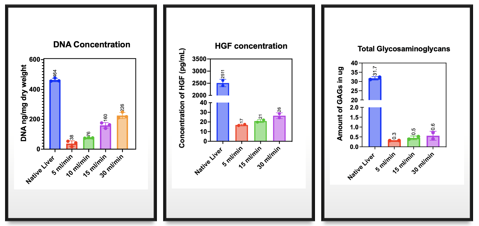 Decellularisation and post recellularisation perfusion were carried out comparing three different infusion rates: 5 ml/min, 15 ml/min and 30 ml/min. Decellularisation quality, ECM integrity and recellularisation characteristics were assessed by (1) light microscopy, (2) DNA quantification,  (3) structural ECM component (Collagen, Elastin, Fibronectin and Laminin) immunofluorescence,  (4) Hepatocyte growth factor (HGF) and total Glycosaminoglycans (GSGs) quantitative assays, and (5) Rat bone marrow stem cell engraftment characteristics after recellularisation.