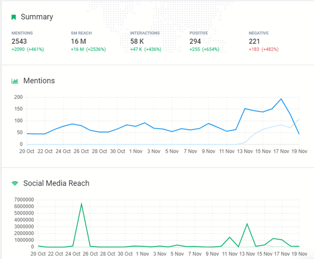 Method: We utilized Brand24, a social media monitoring tool, to collect data over a month (Oct 20, 2023-Nov 19, 2023) using keywords related to kidney transplantation. The analysis included metrics such as the volume of mentions, sentiment analysis, reach on social and non-social platforms, user-generated content, and engagement metrics like likes and interactions. Trending hashtags were also tracked to evaluate topic-specific engagement.