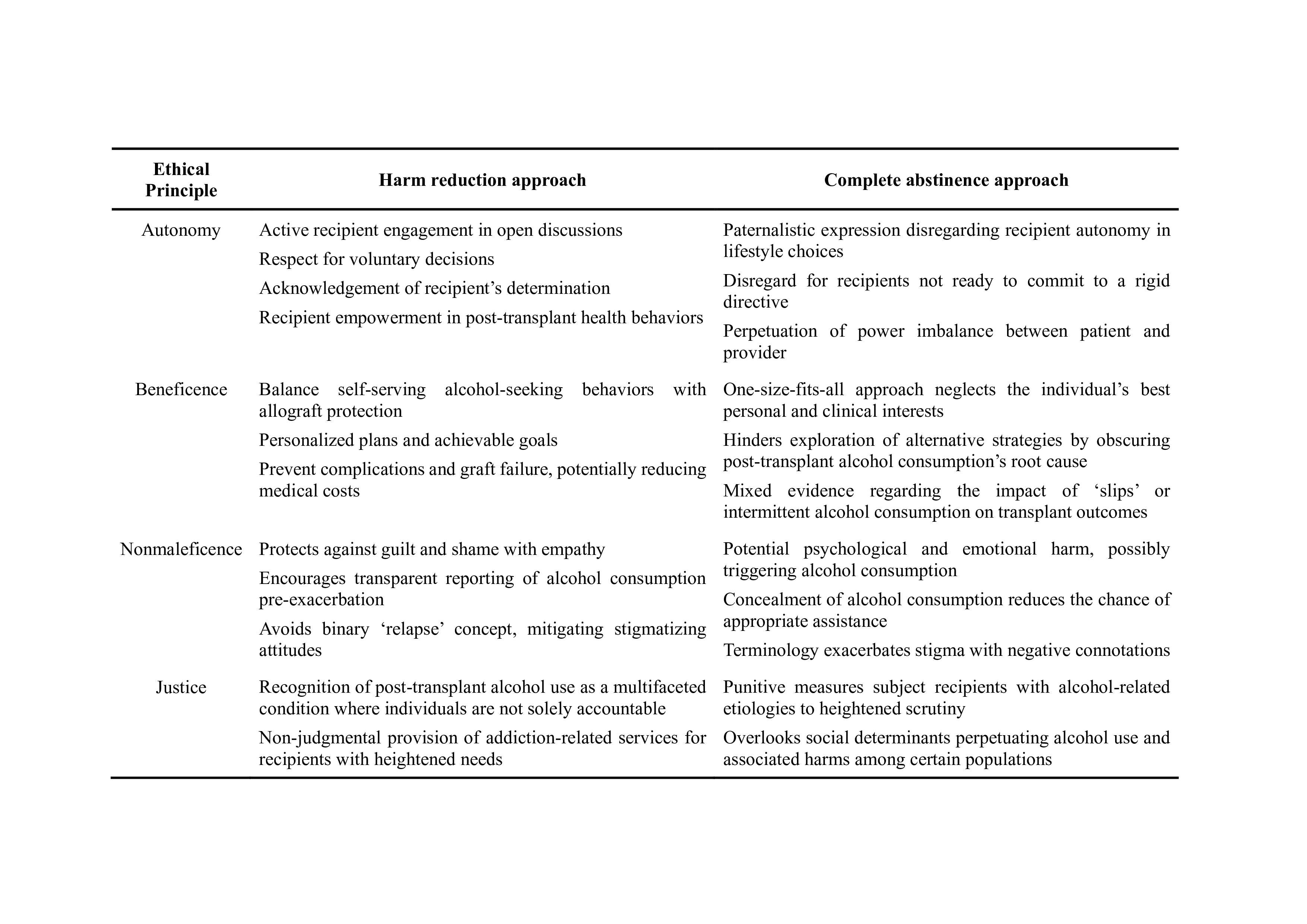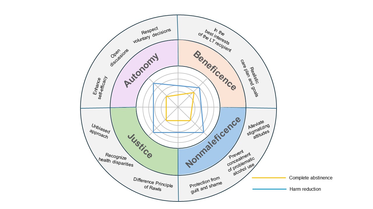 Conclusion: Compared to conventional abstinence-oriented approaches, harm reduction for post-LT alcohol consumption offers improved alignment with the four ethical principles in biomedicine (Figure 1), as well as positive clinical outcomes. Embracing the philosophy of harm reduction, clinicians must foster an environment of mutual respect, prioritize recipients’ best interests, diminish stigma, and guarantee equitable treatment for LT recipients with alcohol-related etiologies.