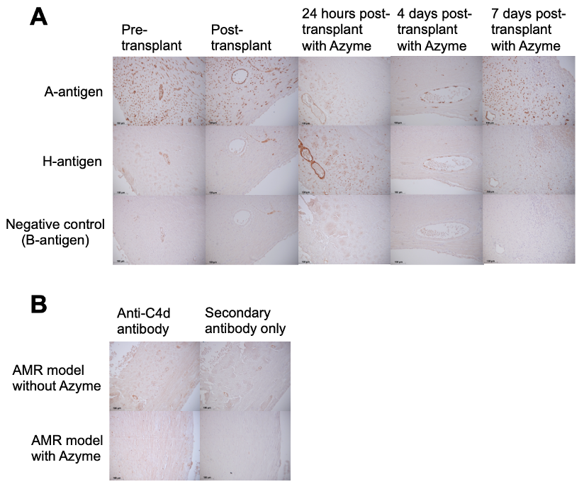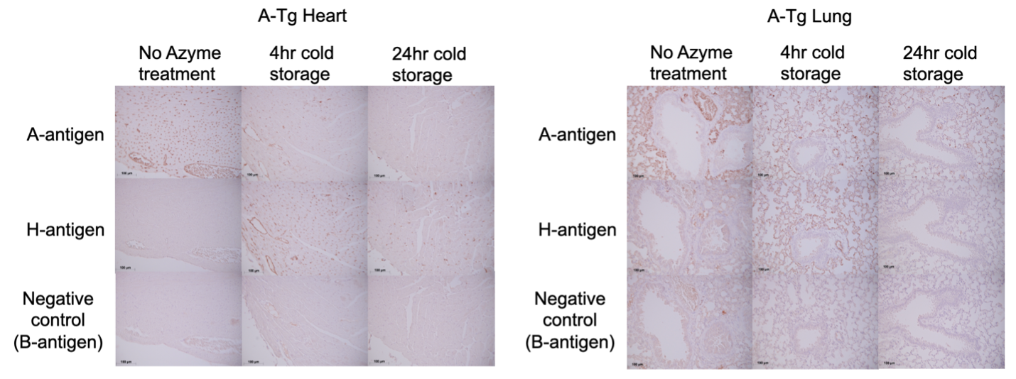Conclusion: Azyme treatment rapidly depleted A-Ag in A-Tg mouse heart and lung. A-Ag re-expression was minimal in heart grafts 4 days post-Tx, but fully visible 7 days post-Tx. Preliminary findings showed that A-Ag removal by Azyme treatment prevented early AMR. Longer term AMR studies will offer further insight into the effectiveness of temporary A-Ag depletion in avoiding AMR. Clinical application of Azymes may permit additional ABOi Tx, offering lifesaving treatment for individuals for whom compatible organs may not be found and utilizing organs otherwise discarded.