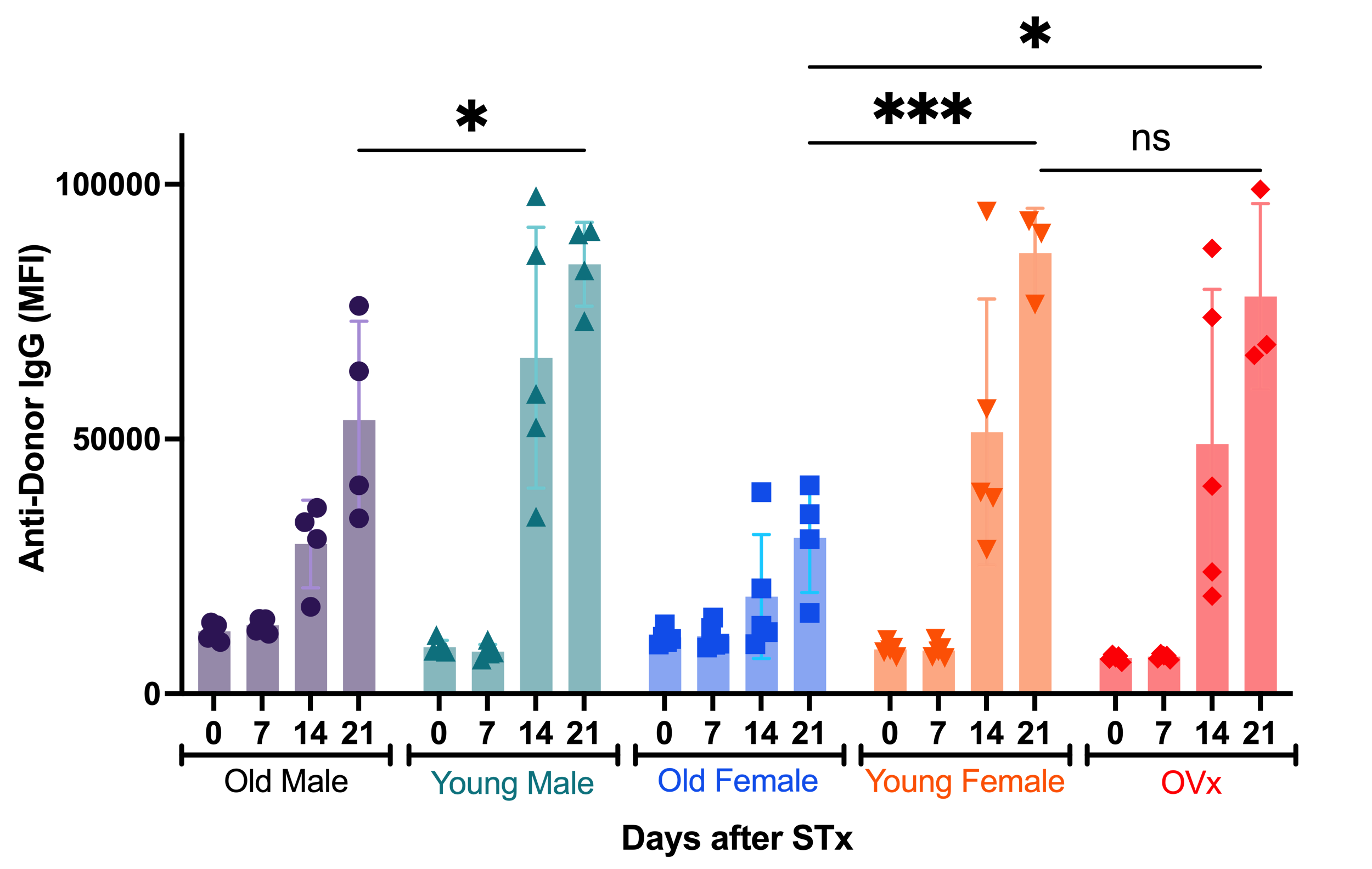 To further analyze the effects of aging on sensitization, we made use of young and old female and male C57BL/6 mice (3 and 20 months, respectively), that underwent fully MHC mismatched skin transplants from either female or male young DBA/2 mice; an additional group of young female animals underwent ovariectomies prior to transplant. Recipient serum was collected at serial intervals (end of the observation period by day 21); anti-donor IgG levels were measured by flow cytometry.