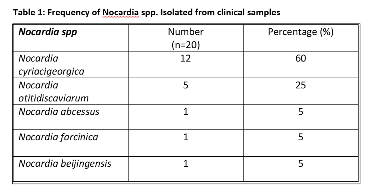 Conclusion: Nocardia cyriacigeorgica was the most frequently isolated Nocardia spp. and showed high Imipenem resistance. Cotrimoxazole, Linezolid and Amikacin remain good empirical options for treatment of Nocardiosis.