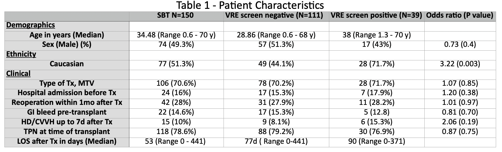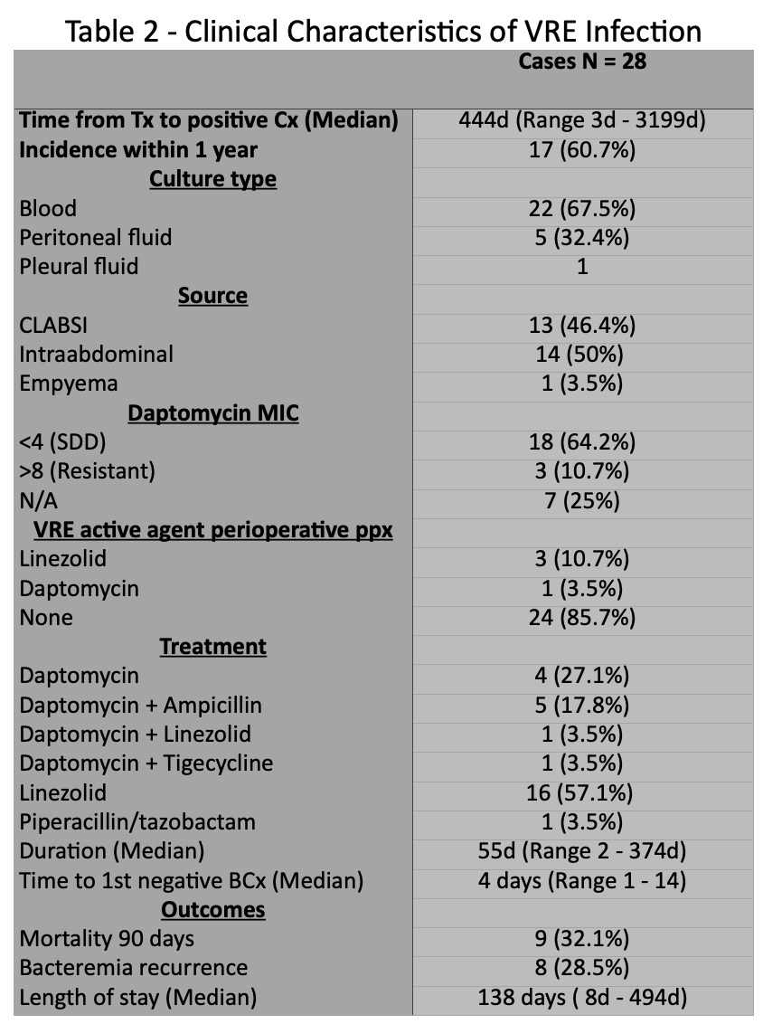 Results: We identified 150 consecutive patients (table 1); 74 (49.3%) were male, 45 (30%) Hispanic, with a median age of 34 (IQR 0.6 - 70). Thirty-nine (26%) had a positive VRE screen at any point during the study; Fifteen (10%) had a positive VRE screen prior to transplantation. Twenty-eight (18.6%) developed VRE infection (bacteremia or intra-abdominal infection) after transplant, with 16 (60%) occurring in the first year. Twenty-one (75%) bloodstream infections, 6 (21%) intra-abdominal and 1 (3.5%) pleural infection. Median duration of bacteremia was 4 days (range, 1-14). Bacteremia recurrence occurred in 8 (28.5%) patients. Positive VRE surveillance pre-transplant (OR 3.41 [95% CI: 0.94 to 12.26]; p 0.06) was a risk factor for VRE infection in the first year after transplant. Median length of hospital stay due to VRE infection was 138 days (range, 8-417d). At median follow-up of 1168 days (IQR 365 - 4307), two  (7.1%) patients developed biopsy-proven rejection within 90 days after VRE infection and 90-day mortality in patients with VRE infection was 32.1% (9/28).