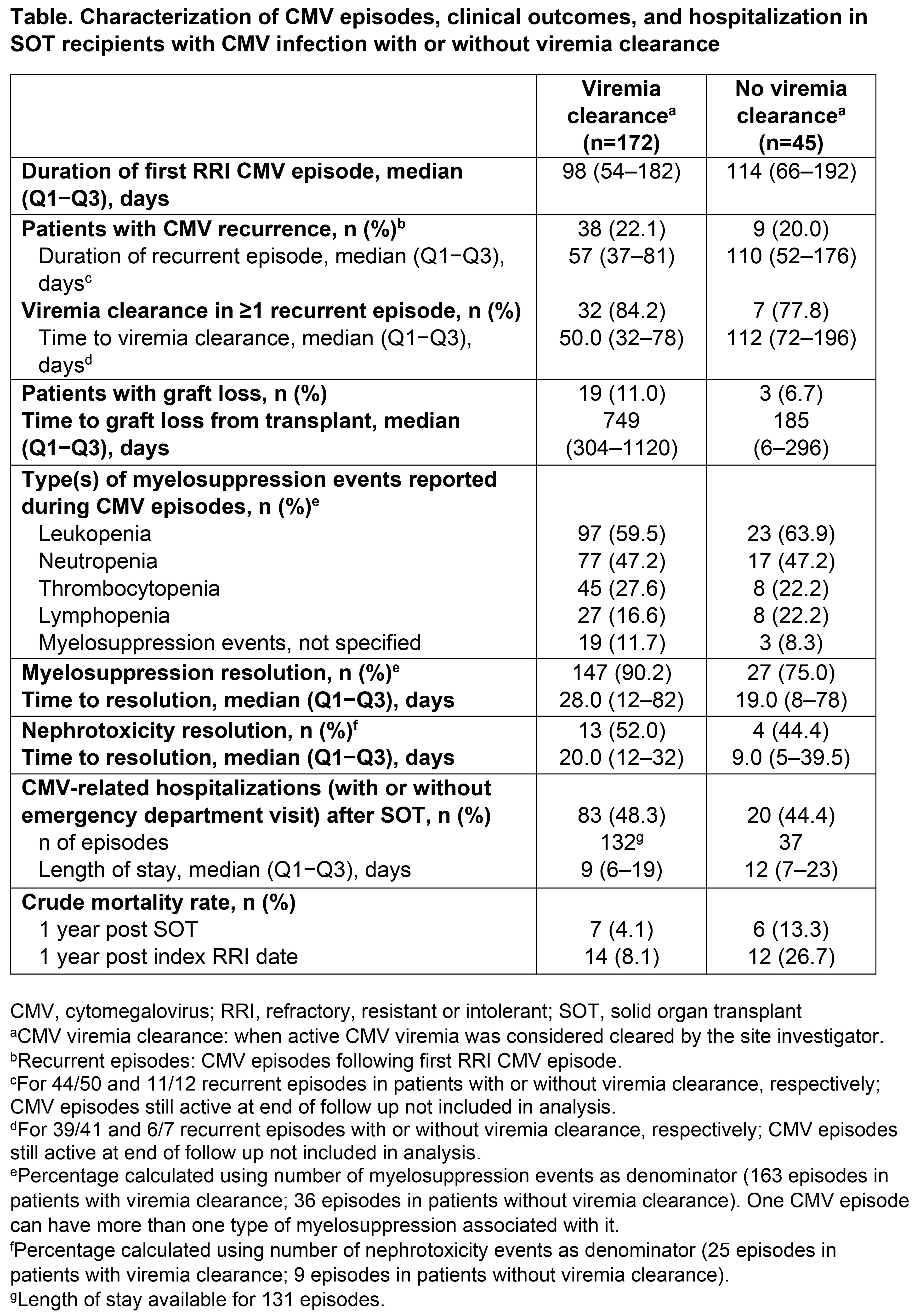 Results: Among 217 patients with a first RRI CMV episode and viremia clearance data, 172 (79%) achieved viremia clearance and 45 (21%) did not. In patients with vs without viremia clearance, respectively, median age was 58 vs 57 years, and 59% vs 82% were male. Of the 172 first RRI CMV episodes with viremia clearance, 54% were identified as refractory, 31% as intolerant, and 26% as resistant (categories not mutually exclusive). Of the 45 first RRI CMV episodes with no viremia clearance, 56% were identified as refractory, 42% as intolerant, and 27% as resistant. CMV recurrence occurred in 22% and 20% of patients with vs without viremia clearance, respectively (Table). Of the patients with vs without viremia clearance, respectively, 19/172 (11%) vs 3/45 (7%) patients experienced graft loss following SOT (median time to graft loss: 749 vs 185 days, respectively; Table). Myelosuppression events during CMV episodes were reported in 98/172 (57%) and 24/45 (53%) patients with vs without viremia clearance, respectively (Table), with valganciclovir and ganciclovir the most often used at myelosuppression diagnosis. Nephrotoxicity events occurred in 19/172 (11%) and 8/45 (18%) patients with vs without viremia clearance, respectively (Table), and the agents most often used when nephrotoxicity events occurred were foscarnet followed by valganciclovir, vs valganciclovir followed by foscarnet, respectively. CMV-related hospitalizations with/without emergency department visits occurred in 48% of patients with viremia clearance vs 44% of patients without viremia clearance (Table). Notably, the overall mortality within 1 year of RRI identification in patients without viremia clearance was higher than in those with viremia clearance (27% vs 8%, respectively).