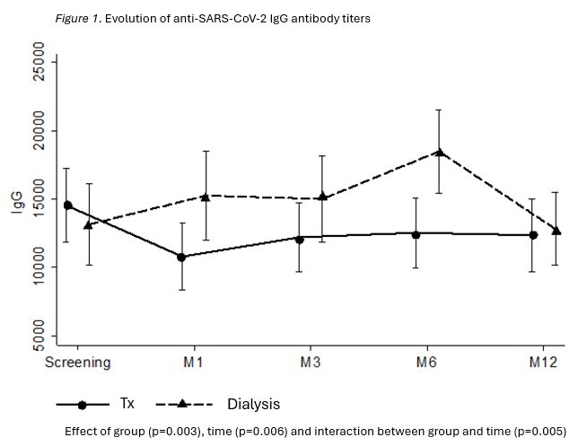 Results: There was no sororreversion during the period of follow-up. The anti-SARS-CoV-2 IgG titers were similar at Screening, 1, 3 and 12 months and lower in KTRs at 6 months [KTR 5,529.8 (IQR 2,514.2-19,337.4); DP 14,427.9 (IQR 6,605.5-35,285.2); p<0.001).