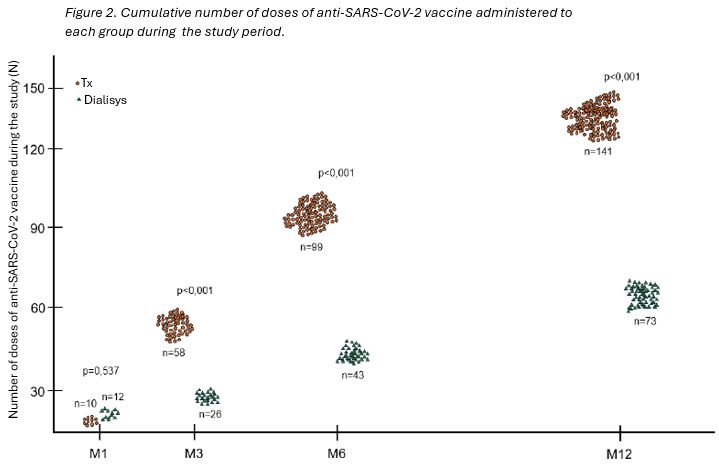 Introduction: Kidney transplant recipients (KTRs) have an inferior immune response to vaccination due to chronic immunosuppression compared to dialysis patients (DPs). This study aims to measure the effect of de novo immunosuppression on long-term humoral and cellular immune response in CKD patients submitted to kidney transplant.