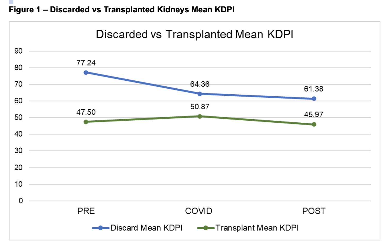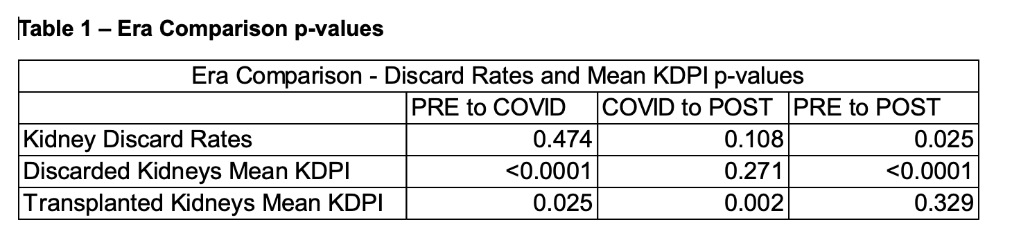 Methods: We collected data from our internal electronic medical record on DDK discards, transplants, and KDPI from PRE, COVID, and POST eras. The study spans January 1, 2018 – October 31, 2023, examining 385 PRE, 447 COVID, and 433 POST donors. Statistical analyses were performed to assess the significance of observed trends and differences.