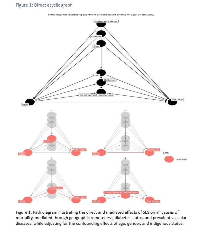 Results: We included a total of 35,239 incident patients with kidney failure who initiated dialysis in Australia between 2005 and 2019, with a median (IQR) follow-up period of 4.0 (2.0, 7.1) years. Of these, 20,597 (54%) patients were from low SES backgrounds. Compared to patients from higher SES backgrounds, those from lower SES experienced a 1.2-fold increased risk of death (HR (95%CI) = 1.2 (1.1-1.3)). The proportions of the effect between SES and all-cause mortality on dialysis mediated by geographical remoteness, CVD and diabetes were 30.5%, 8.6%, 15.5%, respectively, accounting for 54.6% of the total effect, while SES explained 45.4% of the total effect, directly. Compared to patients from high SES backgrounds, those from lower SES backgrounds experienced a higher risk of CVD-related mortality, HR (95%CI) = 1.3 (1.2-1.5). However, geographical remoteness did not mediate the effect of SES on CVD-related mortality. On the contrary, the effect of SES on CVD-related mortality was mediated by CVD and diabetes, with CVD and diabetes contributing 10.8%, and 18.9%, that is 29.7% of total effect, while the direct effect of SES accounted for 70.3% of the total effect. Patients from low SES backgrounds experienced a higher risk of infection-related mortality compared to those from higher SES backgrounds, HR (95%CI) =1.1(1.0-1.3). This effect was mediated through CVD and diabetes, with CVD and diabetes contributing, 8.3% and 19.5%, that is 24.1% of total effect, while the direct effect of SES accounting for 75.9% of the total effect.