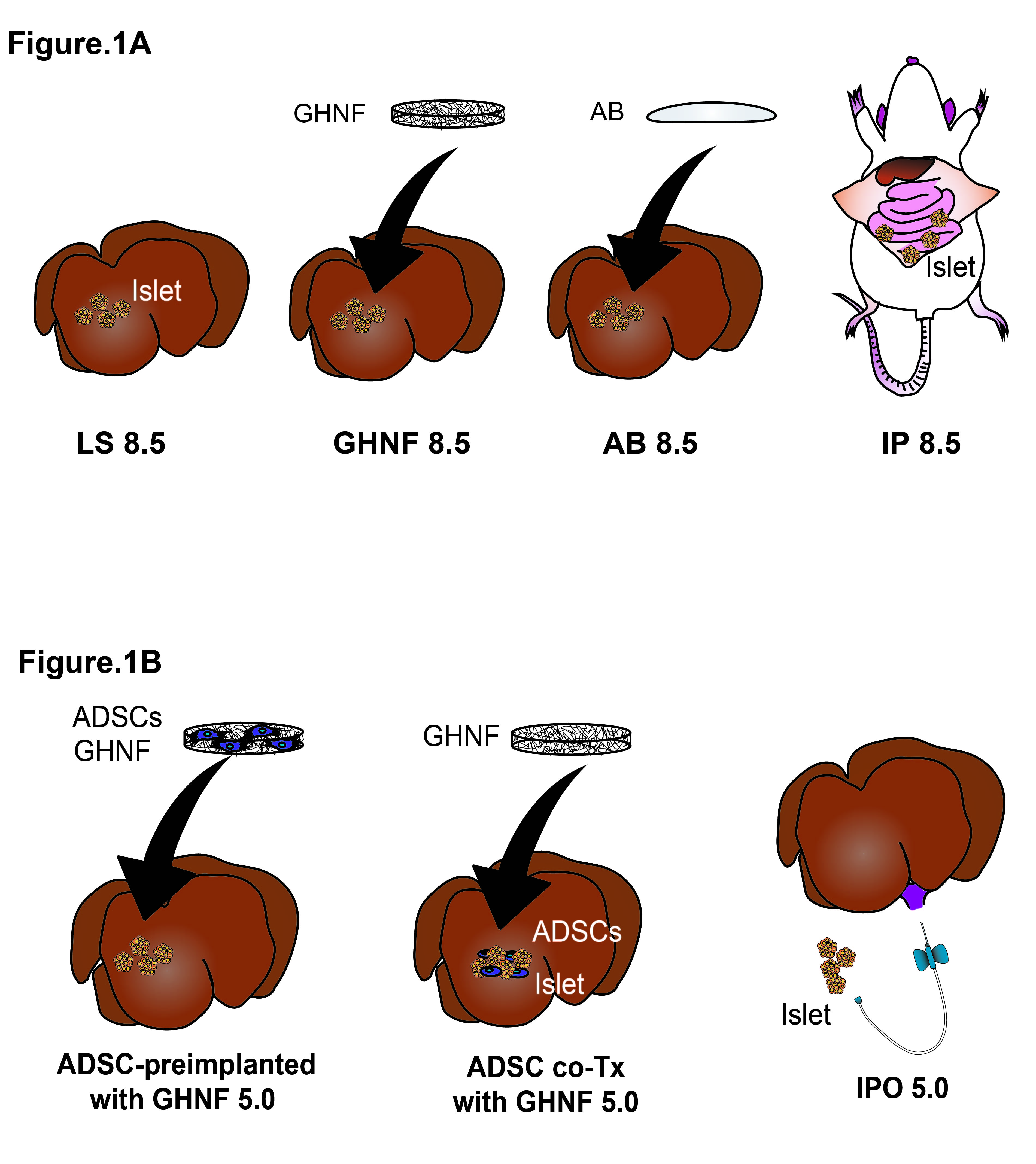 Method: In the experimental groups, 8.5 islet equivalents (IEQs)/g of syngeneic islets were transplanted onto the LS (Fig 1A). The transplanted islets were uncovered (LS 8.5), covered with the GHNF (GHNF 8.5) or covered with an adhesion barrier (AB 8.5). Intraperitoneal Tx (IP 8.5), in which islets were placed into the abdominal cavity, excluding the LS, served as a control group. To examine the additional effects of ADSCs, 5.0 IEQs/g of islets were transplanted onto the LS covered by ADSC-preimplanted GHNF (ADSC-preimplanted GHNF 5.0), or co-transplanted with ADSCs onto the LS covered by GHNF (ADSC co-Tx with GHNF 5.0, Fig 1B). These groups were also compared with the GHNF 5.0 group; the most optimized procedure was compared to the IPO 5.0 group. Graft function was evaluated by non-fasting blood glucose (BG) levels, intravenous glucose tolerance test, and cure rate. Extracellular matrix (ECM) and neovascularization were evaluated by immunohistochemistry. To elucidate the mechanisms of the effects of ADSCs, cytokines and growth factors in the culture supernatant were analyzed using an in vitro model.