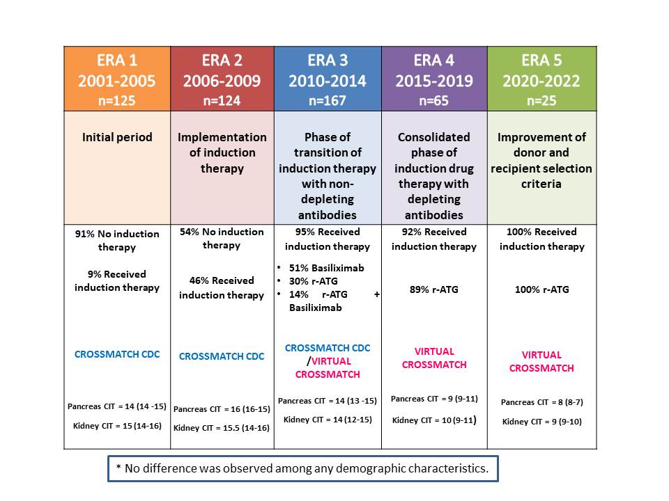 Methodology: This is a single-center, retrospective, observational study that enrolled 506 patients undergoing consecutive SPK transplant between January 2001 and April 2022. The cohort was divided into 5 eras according to the predominant change in the institutional protocol: Era 1 (2001-2005) the initial period; Era 2 (2006-2009) the implementation of induction therapy with non-depleting antibodies; Era 3 (2010-2014) transition to depleting antibodies and the use of virtual crossmatch; Era 4 (2015-2019) induction therapy using depleting antibodies; Era 5 (2020-2022) the improvement of the donor and recipient selection criteria. The primary outcome was patient survival according to the era. The secondary outcome was pancreas and kidney graft survival according to the era. (Table 1)