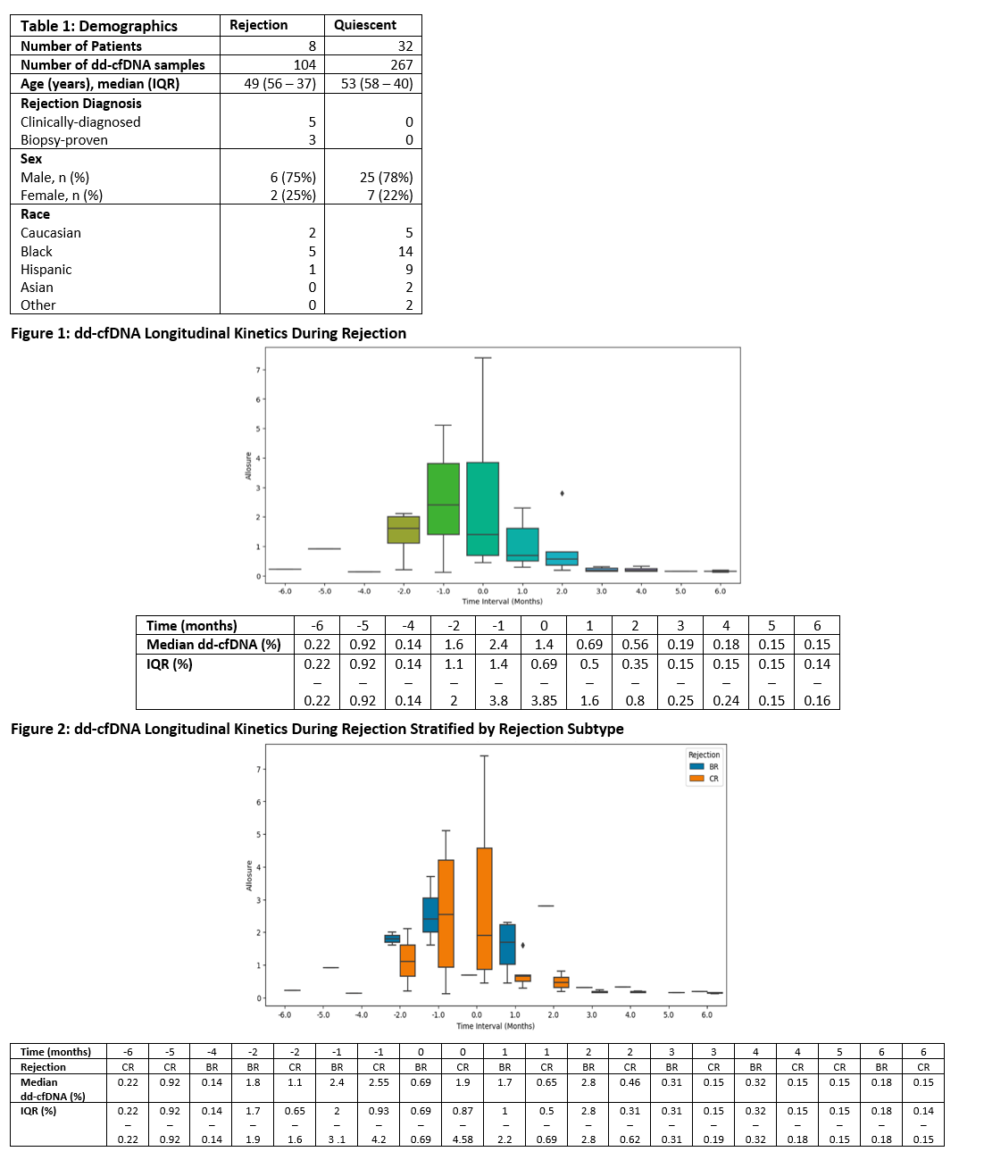 Method: This is a prospective, single-center study of SPKTx recipients enrolled from Nov 2018 to May 2021 that underwent serial dd-cfDNA (AlloSure®) testing at 2 weeks post SPKTx, followed by monthly for year 1, then every 3 months in years 2-3, and every 6 months thereafter. Rejection episodes included biopsy proven rejection (BR) and clinically diagnosed rejection (CR). CR was defined as a constellation of sustained elevations in dd-cfDNA, rising or dnDSA, or persistent elevations of lipase or creatinine. CR was treated presumptively. Baseline dd-cfDNA was defined as the patient specific nadir result obtained prior to rejection diagnosis. Month 0 was the date of rejection diagnosis. The reference quiescent cohort was defined as not meeting criteria for CR, BR, or other injury on biopsy during study.