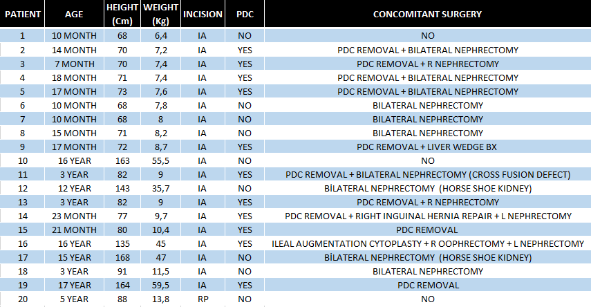 The most frequent post-operative surgical complications seen in our series was intestinal obstruction (n=3). 2 of them had a concomitant NNx and one of these 2 patients had also developed urine leak (n=1) which required laparotomy during the follow up and the other one had a history of a previous intraabdominal surgery naming left surrenalectomy for a neuroblastoma 3 years before the KTx. The third case who had a history of bilateral NNx in an outer center 2 years before KTx due to Wilms tumor, whose KTx was performed by RP, developed ileus at post-operative day 5 which also required laparotomy. The other complications were evisceration (n=1) and surgical site hemorrhage (n=1) which received red blood cell transfusion as the sole management for the bleeding.