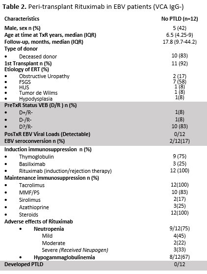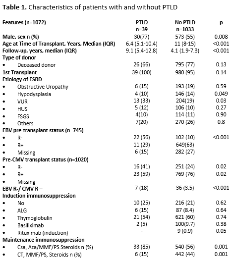 Introduction: Post Transplant lymphoproliferative disorders (PTLD), the most common neoplasms in transplanted children are mostly associated with Epstein-Barr virus (EBV). The aims of our study were: 1. To describe, in a cohort of kidney transplant patients (KTx), cumulative incidence, incidence rate, time of onset (early <1 yr vs. late >1 yr), and clinical and histopathological characteristics of PTLD; 2. To compare patient and graft survival between those with and without PTLD and, in those EBV negative, association between peri-transplant administration of rituximab and primary EBV infection, EBV loads, and development of PTLD