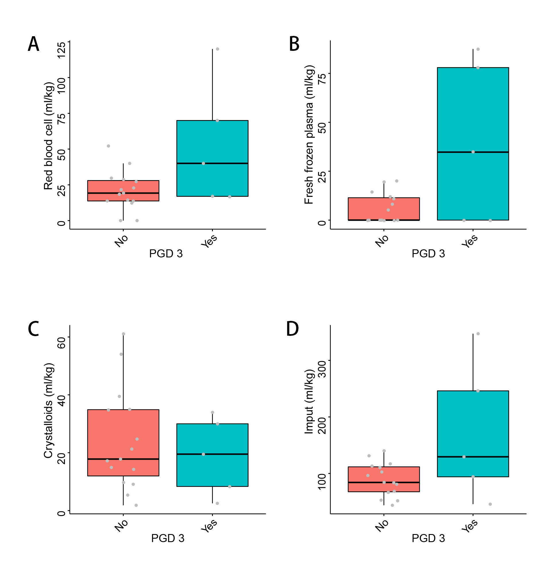 Results: The results showed no significant difference in the incidence of postoperative adverse outcomes between the two groups (P>0.05). The results remained consistent even when the threshold was raised to 20%. Although blood product transfusions and fluid intake were higher in children from the PGD group than in the non-PGD group, the differences were not statistically significant (P>0.05).