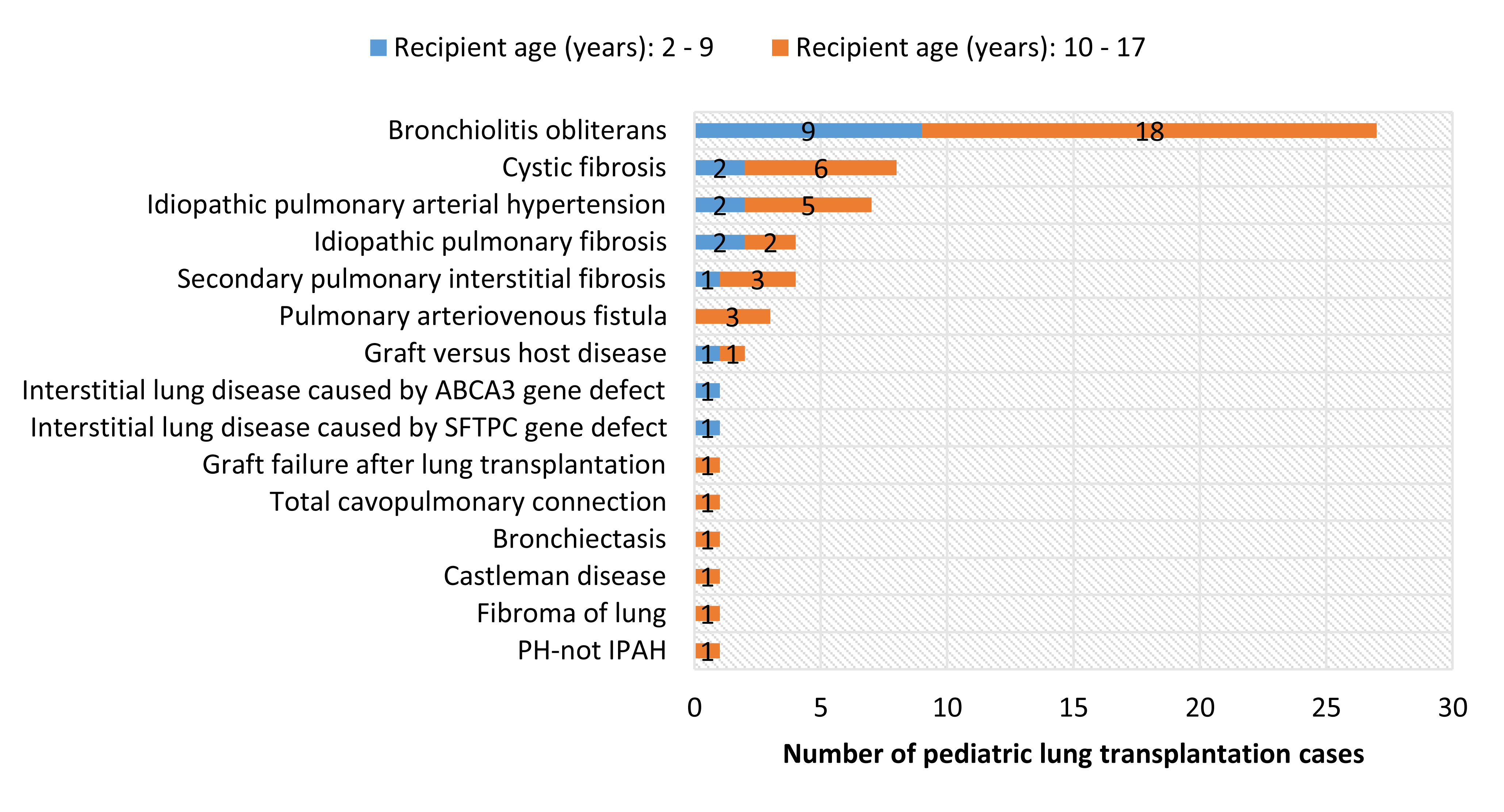The 48.4% were males and aged 2-9 years accounted for 30.6%. The primary indications were bronchiolitis obliterative (42.9%), followed by cystic fibrosis (12.7%), idiopathic pulmonary arterial hypertension (11.1%), idiopathic pulmonary fibrosis (6.3%), and secondary pulmonary interstitial fibrosis (6.3%).