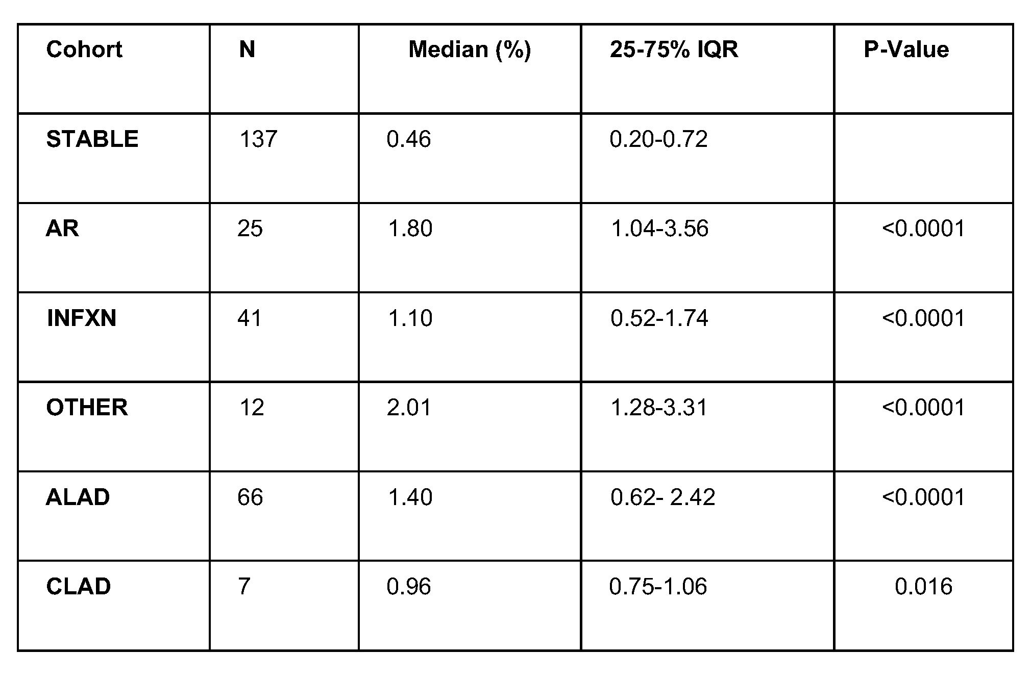 Method: dd-cfDNA (the Prospera™ Lung test; Natera, Austin, TX) results were analyzed with EMR clinical data review to assign an allograft status cohort: Acute Rejection (AR), STABLE,  Infection (INFXN), “probable AR”, Chronic Lung Allograft Dysfunction (CLAD), or “OTHER”. Acute Lung Allograft Dysfunction (ALAD = AR+INFXN combined), was further analyzed. The bootstrapping approach was used to account for potential dependence between samples that came from the same patient. Dd-cfDNA results  were corrected for SLT (2x) by the CLIA-lab algorithm. Cohorts analyzed for median (25- 75% IQR), comparisons by Mann-Whitney U-test with False Discovery Rate (FDR) correction (p<0.05), and AUC-ROC for AR vs Stable and ALAD vs Stable.