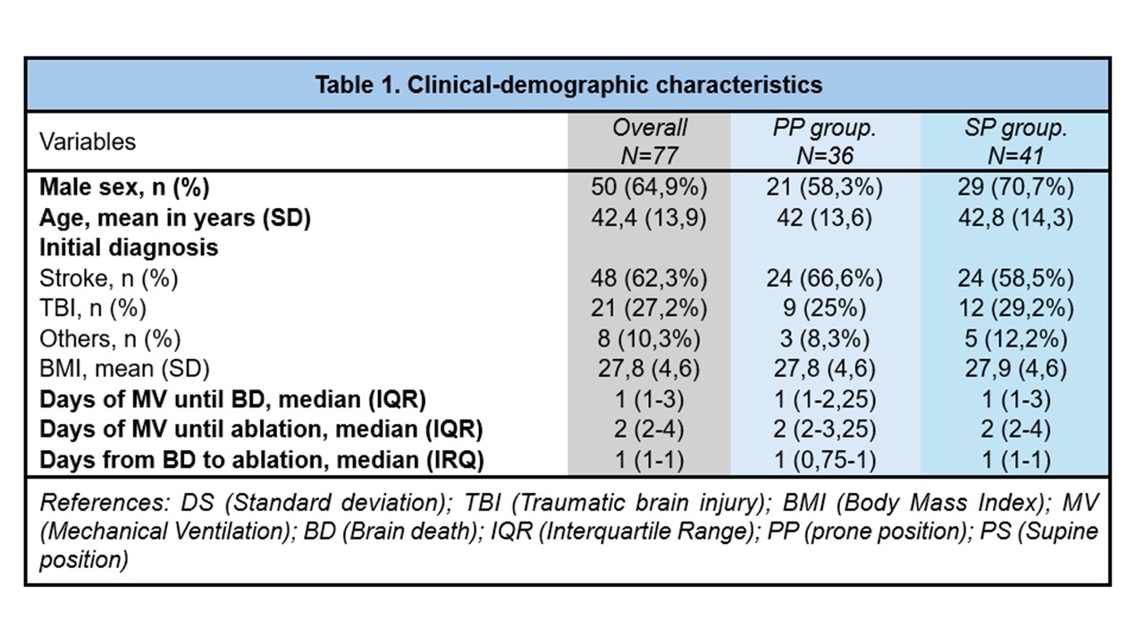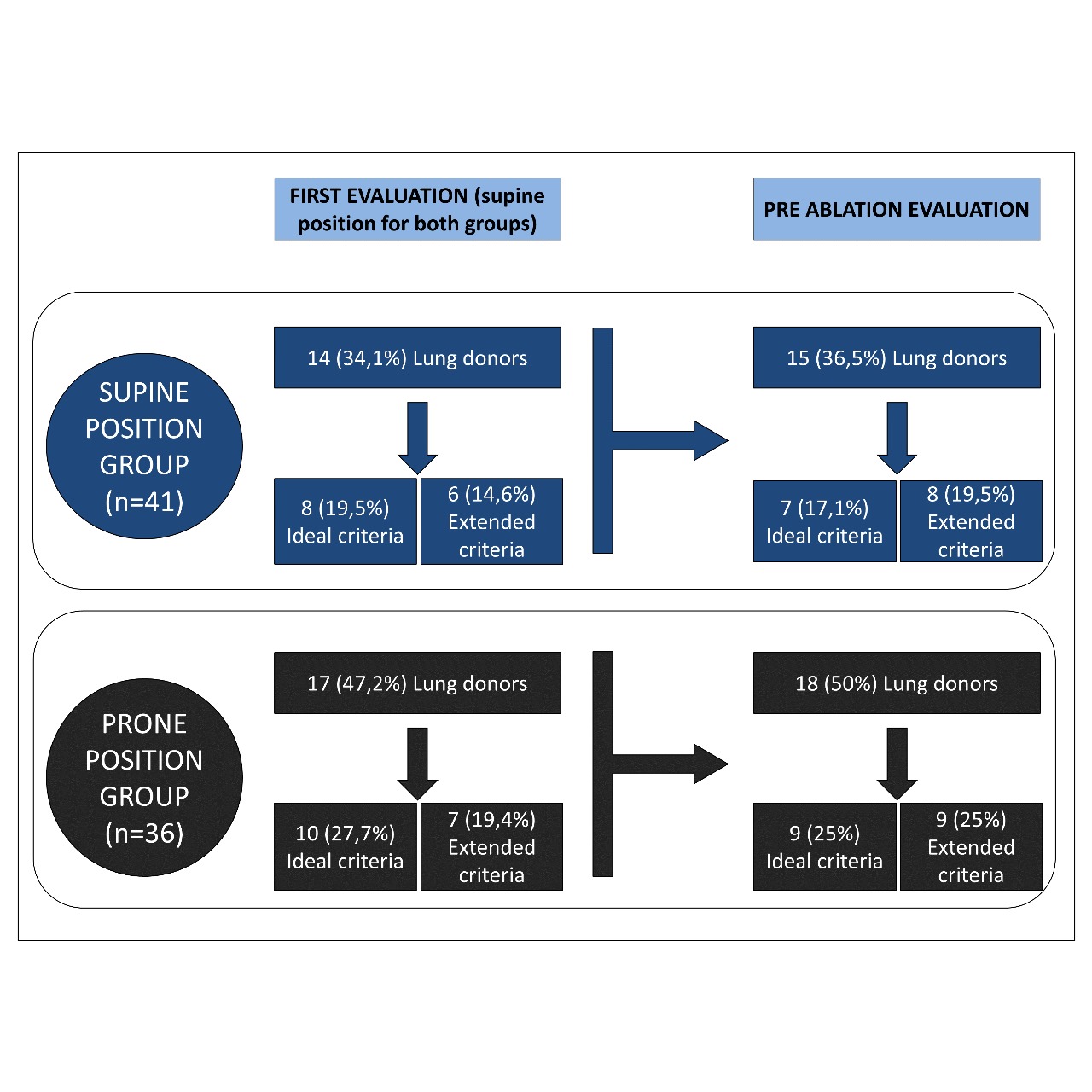 Results: This preliminary analysis includes 77 OD, 36 in the prone group and 41 in the supine group. Table 1 shows clinical-demographic characteristics. Regarding the primary objective, in this preliminary analysis, both groups had 1 potential lung donor more compared to the initial condition (see Figure 1). There were no differences in noradrenaline requirement (median of 0.08 mcg/kg/min initially in both groups and 0.05 pre-ablation mcg/kg/min). Regarding effective donation of other organs, the prone group had a higher percentage of kidney, pancreas, liver, heart, and lung donations. In a sub-analysis including those with PaO2/FiO2 less than 300, it was observed that in the prone group, 6 OD improved their condition to become lung donors, while in the supine group, none improved their condition.